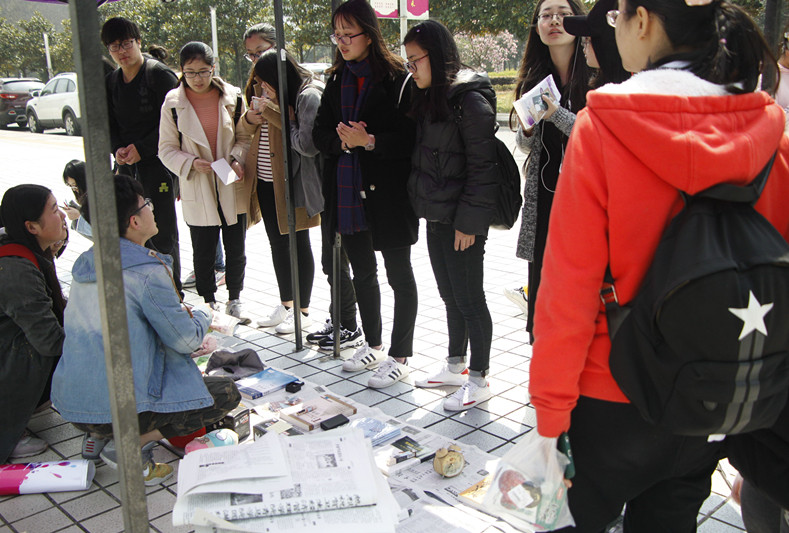 一顶顶紫色的帐篷下,人头攒动,路过的同学们被热闹的氛围吸引,纷纷前来围观。“有喜欢汉服的同学吗?”“玩偶便宜卖!”“能再便宜一点吗?”叫卖声、嬉笑声、还价声等交织在一起,好不热闹。只见摊位上商品琳琅满目,既有《卫生经济学》、《幻夜》等书籍;也有指甲油、散粉等女同学钟爱的化妆品;还有保温杯、闹钟等生活必需品;甚至还有扫地机这样的扫地神器。挑一挑样式,看一看质量,再经过几回讨价还价,买到心仪商品的同学,脸上不时浮现出舒展的笑意。