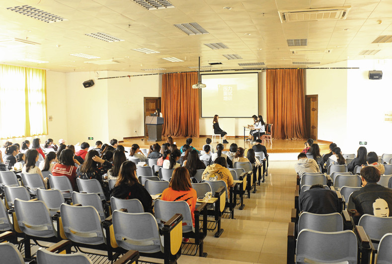 上午十点,培训会在大活107正式开始,活动共四个板块:部门介绍、压力面试培训、无领导小组讨论培训和模拟。主持人丁诗恒首先介绍了员工会的架构,由主席团、主席团助理和十个部门组成。随后,主席团助理和部长们分别上台,简洁明晰的介绍了部门职能和在员工会的地位。而之后以话剧形式展开的压力面试培训,由所有部长和主席团助理倾情出演,生动具体的展现了副部面试中容易出现的错误,如礼仪不到位、态度不端正、过于紧张、着装随意、小动作频繁等问题。台下的同学们兴致盎然,积极发现问题,将培训会的气氛推向了高潮。
