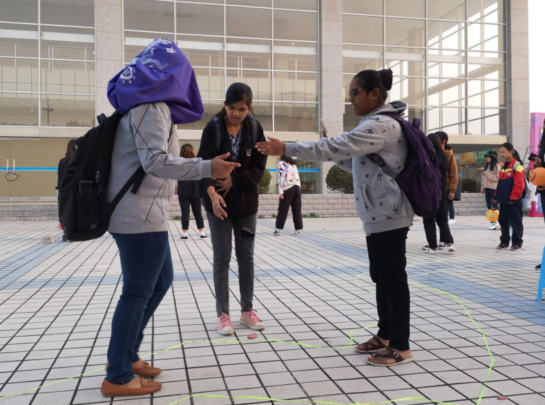 参赛者以宿舍为单位报名参加游戏,共有8个小组报名,每组取了代表各自特色的组名。此次活动由五轮游戏组成。首先是考验成员默契的心有灵犀:每组挑选一人用肢体语言表演题板上的词语,其余人猜题,猜中题数即为本队此轮积分。表演者尽力表演,猜题者迅速反应,大家都展现了极佳的配合能力。接下来的你是我的眼,每队选出一名选手,在“s”形的曲道中行走,其他队员负责指挥队友在不碰到曲道边界的前提下到达终点,按照所用时间排名。“往左、往右、向前......”指挥声充斥着整个场地,有趣的游戏甚至吸引了印度职工的参与。最具挑战性的环节当属亲密无间 ,每队选出两名队员,站在场地的一张大纸上,站满三秒后,纸张对折,再次挑战,直至失败,对折次数前三名的队伍获得积分,考验参赛者协作与统筹规划的能力。接下来的我们都是神枪手,每支队伍挑选两名队员,两人相距五米,接住对方抛来的小方巾。90秒内,数量最多的3支队伍获得积分。看似简单的游戏,做起来时却没有那么容易,掌握技巧才是致胜关键。最后一轮,听歌识曲,由工作人员选取网络热门歌曲 ,每支队伍依次猜歌名,答对得一分,答错不得分,一首首耳熟能详的旋律响起,将气氛推向最高点。五轮游戏结束,TNT队勇夺桂冠,神龙队紧随其后获得第二,阿姨队、奥凸曼吃萝卜队、江山代有才人秃队获三等奖。