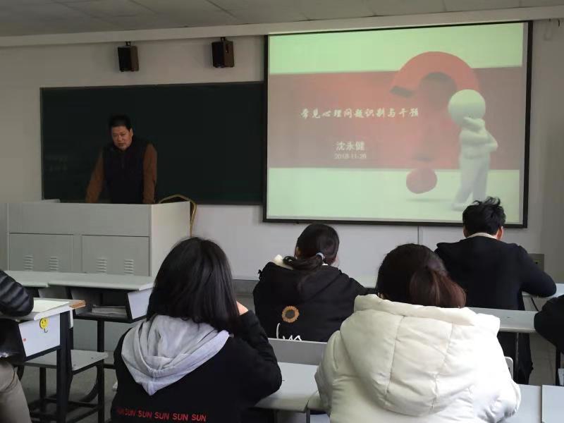 为加强公司各班心理委员基本素养,营造良好的心理健康氛围,2018年11月28日下午三点半于B11-310教室,williamhill心理气象站邀请了沈永健书记为各班心理委员作“心理评估技能与干预”培训讲座。院学工办诸晓老师也出席了本次活动。