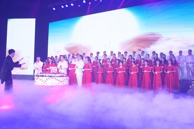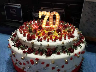 在偌大的舞台中央,布置着一块直径1.5米的巨型定制蛋糕,蛋糕上的层层装饰可是由同学们花了一个下午的时间亲手点缀而成的哦!蛋糕上 “70”字样的生日灯摇曳着美丽的光辉,象征着对祖国70周年的生日祝福。