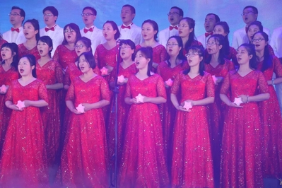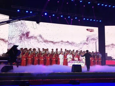 随着美妙的音乐缓缓响起,体育馆里歌声荡漾,宛转悠扬。只见舞台上红裙飘飘,白装倜傥,全体老师献上对伟大祖国最深情的祝福;黄星点点,舞姿曼妙,伴舞的同学们代表着时代最新的期望。