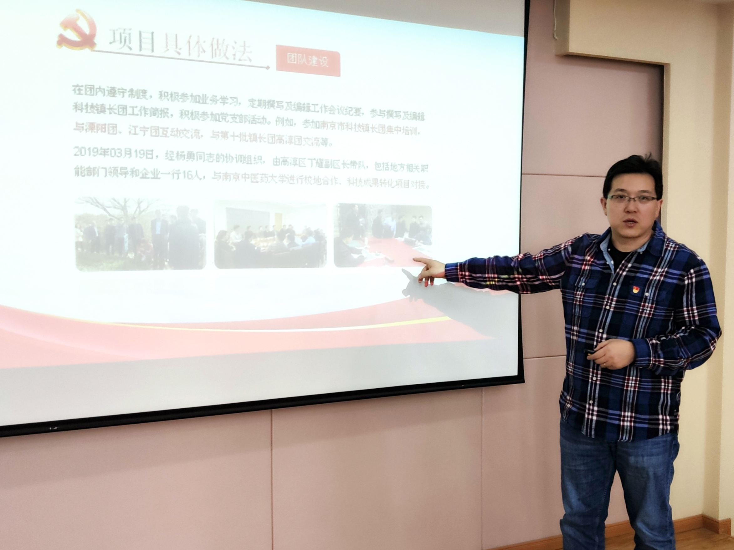 杨勇老师结合挂职岗位介绍了自己挂职期间的工作情况和所取得的成绩。作为江苏省第十一批科技镇长团成员,杨勇老师自去年8月开始在高淳区东坝街道进行了为期一年的挂职工作。挂职期间,杨勇老师充分发挥专业特长和优势,广泛利用高校的人才、信息资源优势以及自身人脉资源,紧密结合公司和公司的学科专业建设,通过课题研究、调研交流、搭建科研合作平台、校地共建活动、地方企业人才引进、建立老员工实习基地等形式,积极推动挂职单位工作开展。
