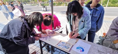 现场气氛热烈,同学们纷纷积极参与,根据自己的喜好,自由选择拼图图案三三两两凑成一堆:有的同学手里举着拼图,好像在思考这一张改拼接在哪儿,有的同学捧着原图,似是在帮助拼图者出谋划策。之后,他们还在空白的位置写下了他们对未来的寄语和对祖国的祝福。