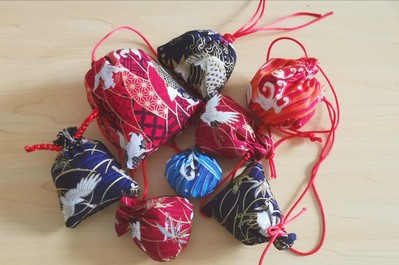 接下来把香袋翻过来,在里面装上事先准备好的驱蚊草药,再填充一些棉花,最后将提绳收紧。属于自己的独一无二的小香囊就诞生啦!