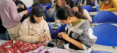 制作香囊的第一步,自然是从缝制香袋开始。各个小组在讨论中选出心仪的花布,由小组长将布裁剪好,分给小组组员。接下来就是真正动手的时候了。首先要把花布反过来对折,将三边都缝上,一直缝到距离开口三分之一处,然后穿上红色的提绳,用那三分之一的布遮盖住绳子,再用针线缝上,这样一个精美的香袋就制作好了。
