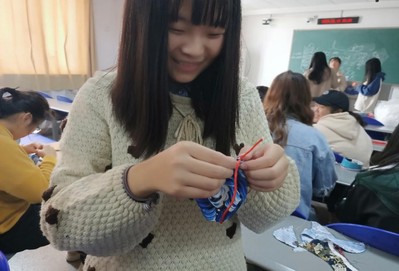 制作香囊的第一步,自然是从缝制香袋开始。各个小组在讨论中选出心仪的花布,由小组长将布裁剪好,分给小组组员。接下来就是真正动手的时候了。首先要把花布反过来对折,将三边都缝上,一直缝到距离开口三分之一处,然后穿上红色的提绳,用那三分之一的布遮盖住绳子,再用针线缝上,这样一个精美的香袋就制作好了。