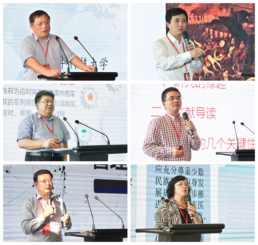 在论坛报告环节,华中科技大学健康政策与管理研究院方鹏骞教授、复旦大学公共卫生公司罗力教授、安徽中医药大学魏骅教授、北京中医药大学管理公司李瑞峰教授、贵州中医药大学人文与管理公司陈瑶教授、浙江中医药大学人文与管理公司许才明教授分别作了《公共卫生应急管理体系建设》《优化公共卫生体系的思考》《中医药协同融合视角下的公共卫生应急管理战略研究》《中医药参与公共卫生应急管理现状及完善建议》《民族医药参与应对突发公共卫生事件体制机制研究》《乡村应对重大公共卫生突发事件与中医药服务能力研究》主题发言。