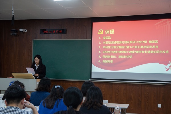 按照公司党校工作安排,williamhill威廉希尔第九期发展对象培训2班开班典礼11月18日下午17:30分在B5_106举行。本次培训由卫管、护理、二附院及人文四家单位合办,卫管公司党委承办,共72名学员参加培训。公司党委副书记、副经理蒋燕老师、马克思主义公司.医学人文公司道德与法律教研室主任、教工一支部书记邹苏老师、williamhill团委书记、卫管与社保党支部书记魏翠妮老师参加开班典礼。会议由卫管公司党委组织员孙文若老师主持。