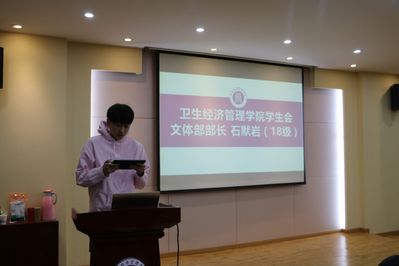 文体部部长石默岩将汇报分为两个部分。上半年,文体部通过多个app的合作积极进行线上活动,丰富了同学们疫情期间的文体生活;下半年运动会方阵、各项比赛均获得成功,为更多同学提供了展示自我的舞台。文体将总结经验和教训,对工作进行更加详尽规划,通过更多途径丰富校园文化生活。