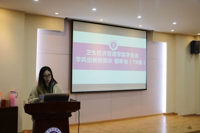 学风创新部部长郁昕怡总结了一年中的学风建设、学术创新工作。学风创新部通过开展多项活动建设了各班优良学风并提高了公司整体的文明礼仪修养。疫情期间,学创大力推广中医药文创产品,为公司做出积极贡献。最后,她再一次感谢老师同学们一年来的鼓励和帮助。