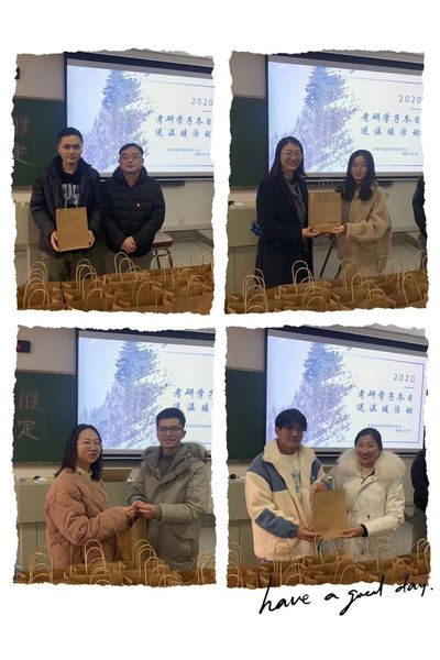 本次活动为考研的同学们精心准备的礼物是一个橙子与一个苹果,分别象征着“心想事成”与“平平安安”。希望在寒冷的冬天能让备战考研的学子充分感受来自公司的温暖和支持。送礼包的过程中,老师们亲切地向同学们了解备战考研的学习生活情况,细心叮嘱考试学习的注意事项,也勉励考研学子在考场上努力拼搏,不辜负母校的培养和期望。