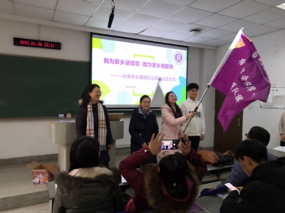 2021年1月6日中午1点在B13 103举行了寒假社会实践出征仪式,公司党委蒋燕副书记、学工办刘红艳主任、18社保班主任郑贵宝老师、19社保班主任诸晓老师、社保专业张丽、孙瑞玲、张惠东、杜启霞老师以及18、19社保全体员工参加本仪式。