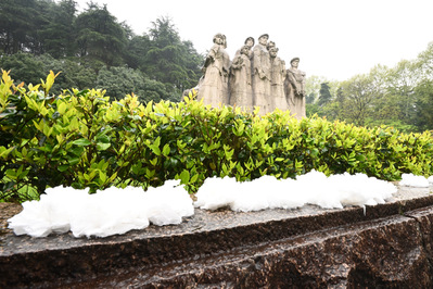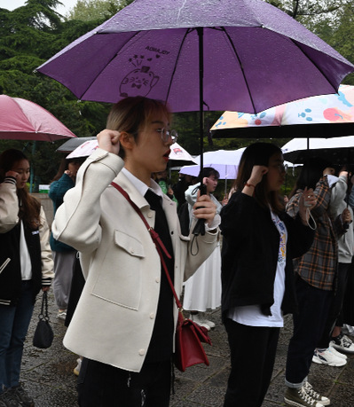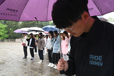 同学们在雨中撑伞为革命英烈献上白纸花,以此传达内心的那一份感激,身处和平时代的我们,虽然无法见到他们,与他们交流,但我们可以在心中为他们祭奠,告慰无数先烈的在天英灵。