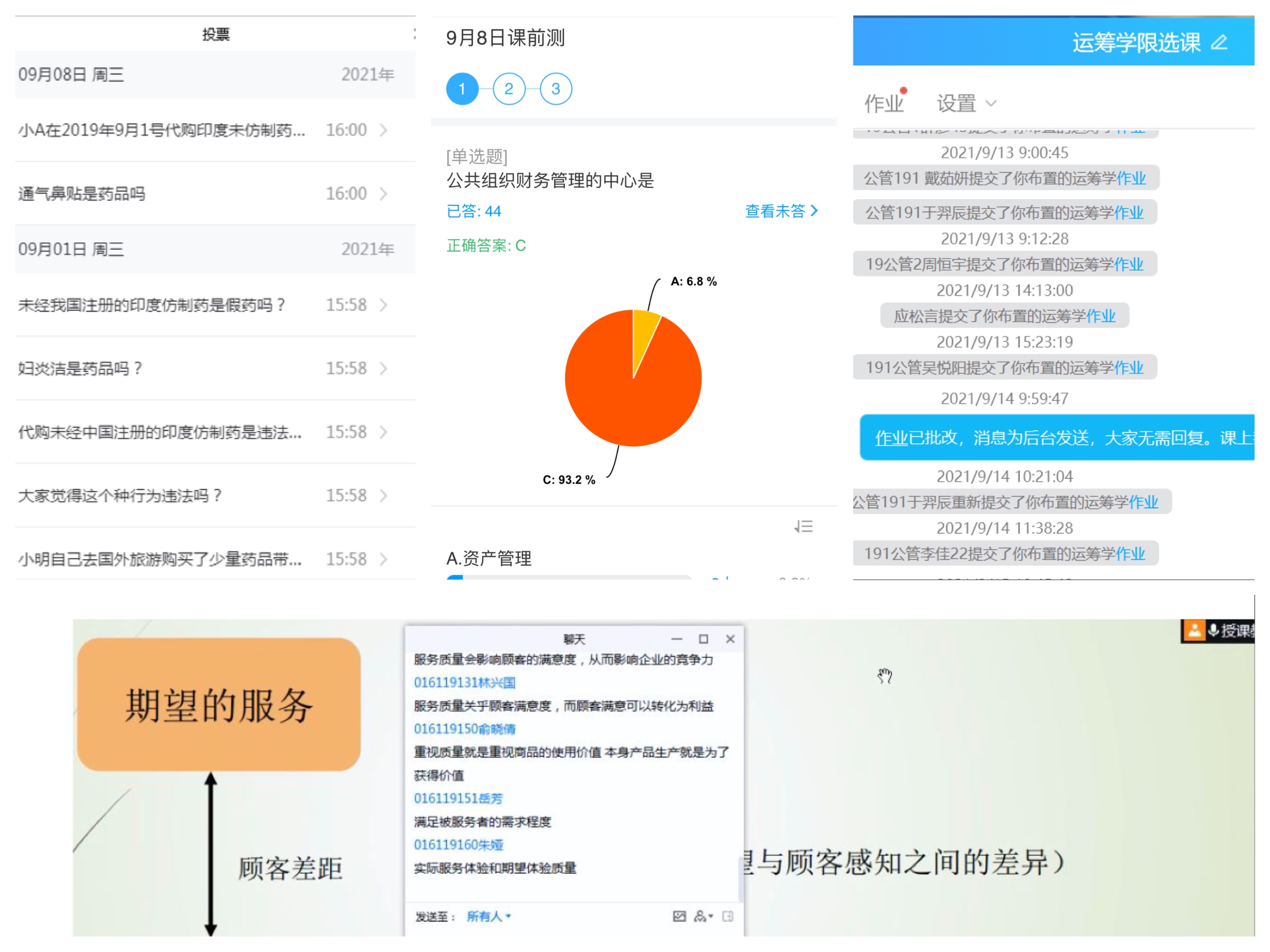 为加强对员工学习过程和学习效果的监督与管理,任课教师采取了课前签到、课堂随机提问、要求员工发学习视频、员工上传问题答案、课后作业布置回复等方式检查员工的学情情况,如史伟老师的《服务营销》、罗凤琦老师的《公共组织财务管理》、李湘君老师的《运筹学》、白庚亮老师的《药事管理学》,以此加强对线上课堂的管控,提高课堂效率。