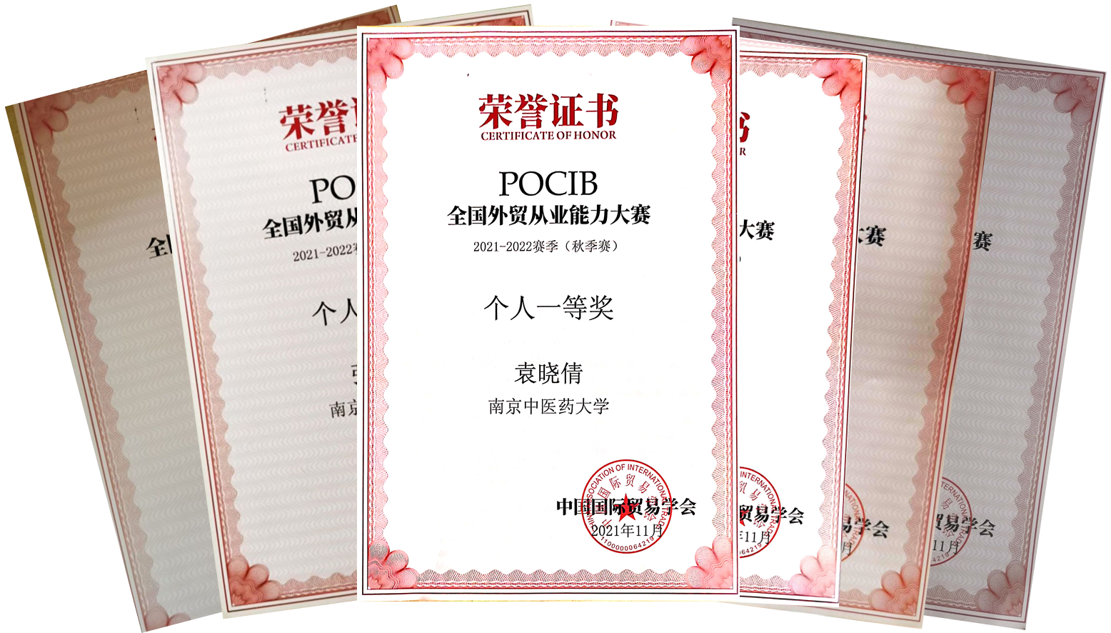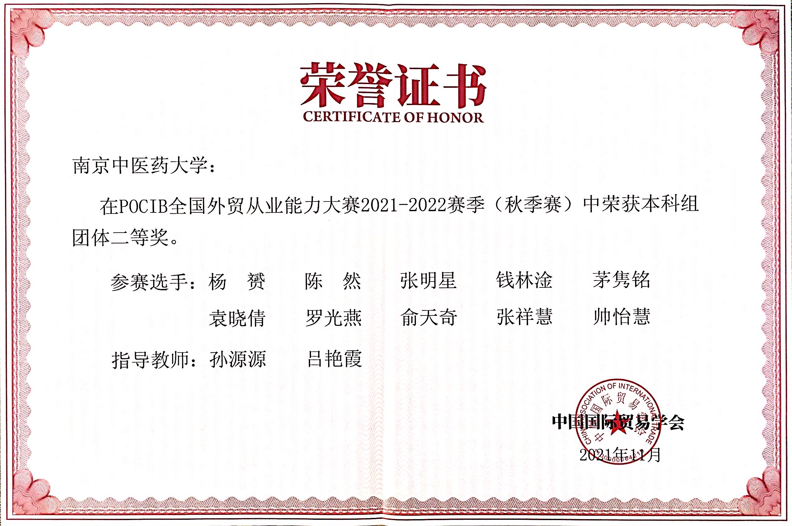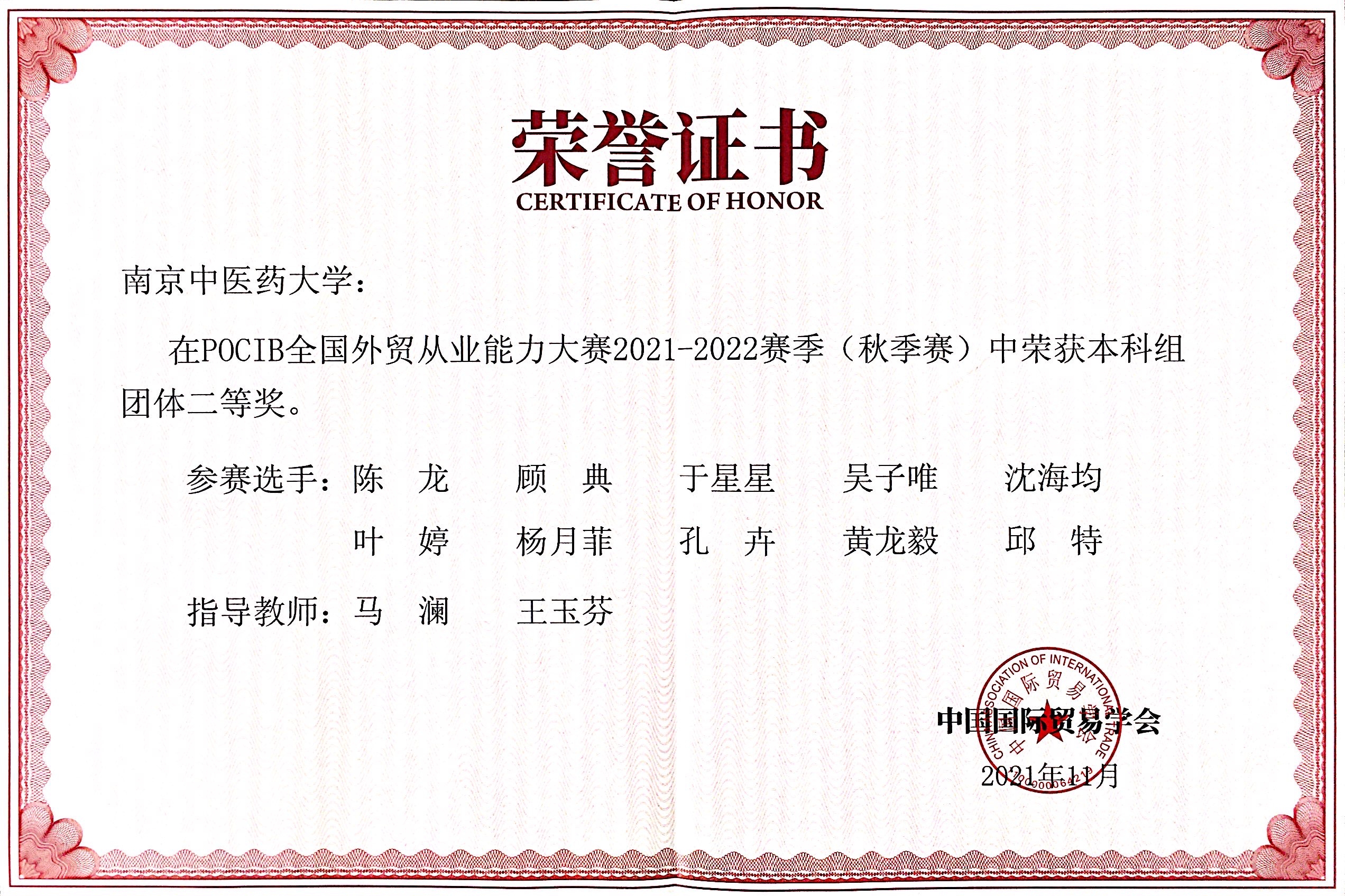 由中国国际贸易学会主办的“第十一届POCIB全国外贸从业能力大赛(秋季赛)”于2021年11月4日上午10点圆满结束。POCIB全国外贸从业能力大赛是目前外经贸相关专业领域参赛人数最多、规模最大且最有影响力的赛事。本次比赛共有来自全国129个本科院校和96个高职院校共计428支队伍、4280名选手参赛。在公司经贸系国贸教研室马澜、孙源源、王玉芬、吕艳霞四位老师悉心指导,以及上届参赛队员韩桃、周易等积极协助下,由公司20名国贸专业员工组成2支参赛队伍,通过历时15天的不懈努力、通力合作和激励角逐,最终分别以团队总分936.67、939.65分(满分1000分)的优异成绩,斩获了POCIB秋季赛团体二等奖2项、个人奖9项的佳绩!