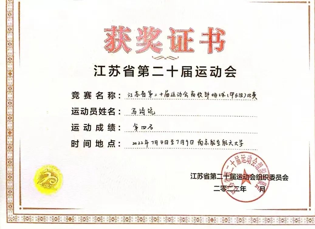 2022/7/9 公司两名同学参与并代表公司江苏省第二十届运动会高校部排球甲B组比赛第四名;