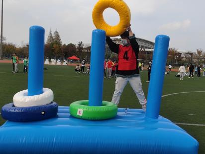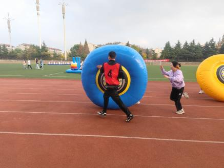 最后是无敌风火轮,在跑道上同学们合作推着大风火轮往前跑,有同学拉着风火轮往前跑,也有同学扶着它保持平衡。由于太着急,风火轮在中间倒下了一次,但大家迅速调整好了状态,顺利地完成了比赛,获得了二等奖的好成绩。