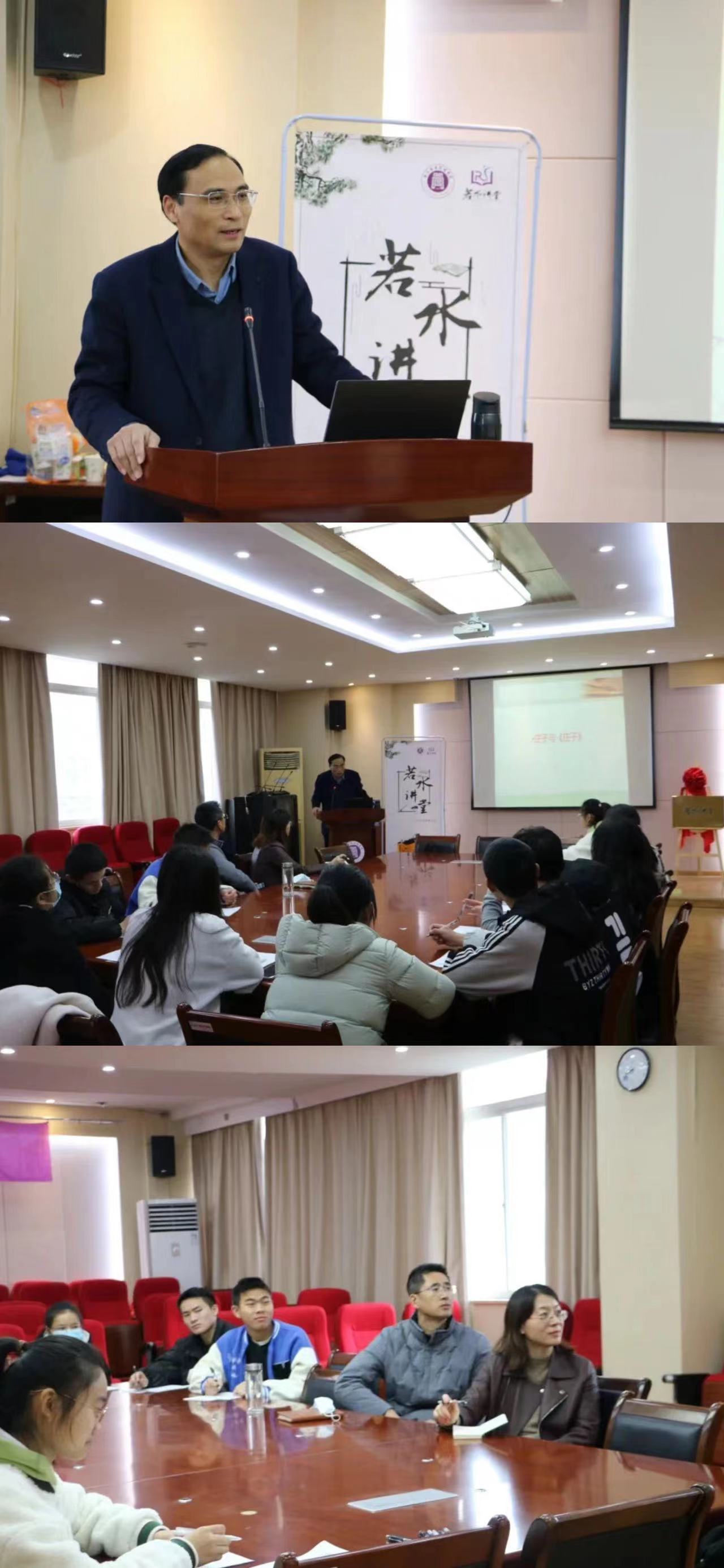 上善若水,厚德载物。为进一步丰富同学们对传统文化的认知,帮助同学们领悟庄子思想,williamhill于12月7日14:30在B11-414开展了“若水讲堂”第五讲,本次的主讲嘉宾为williamhill威廉希尔教务处副处长、williamhill威廉希尔中医国学研究所所长王明强教授。出席本次活动的有公司党委副书记、副经理蒋燕老师,工会主席孙文若老师、学工办辅导员左桂老师以及线上线下80余名同学。