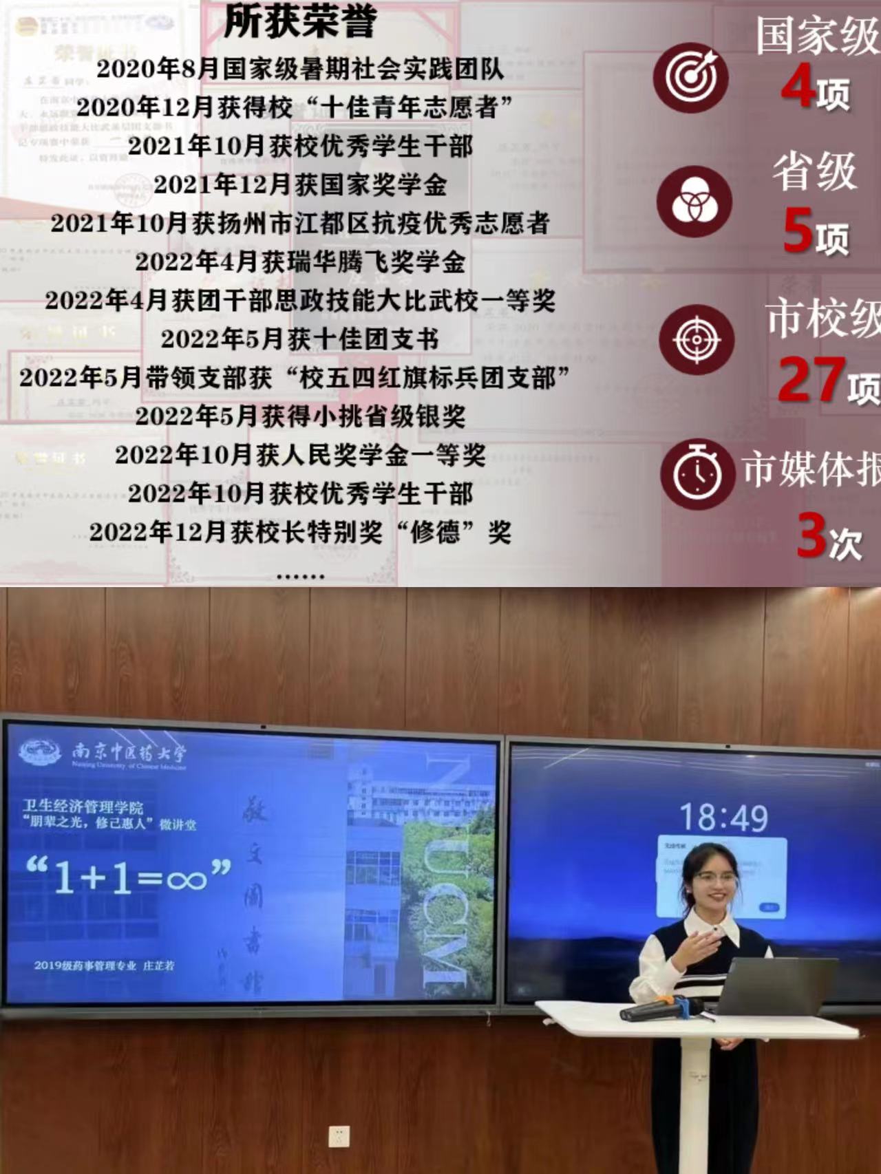 “道虽弥,慢行必至”。深知凡事不能一蹴而就的庄芷若时刻要求自己做最先起飞的笨鸟。从专业第三十名进步到第一名,连续两年综测位于专业第一,获得国家奖学金、董事长特别奖“修德”奖、人民奖学金一等奖、“何崇本奖学金”一等奖等奖学金超6万元。
