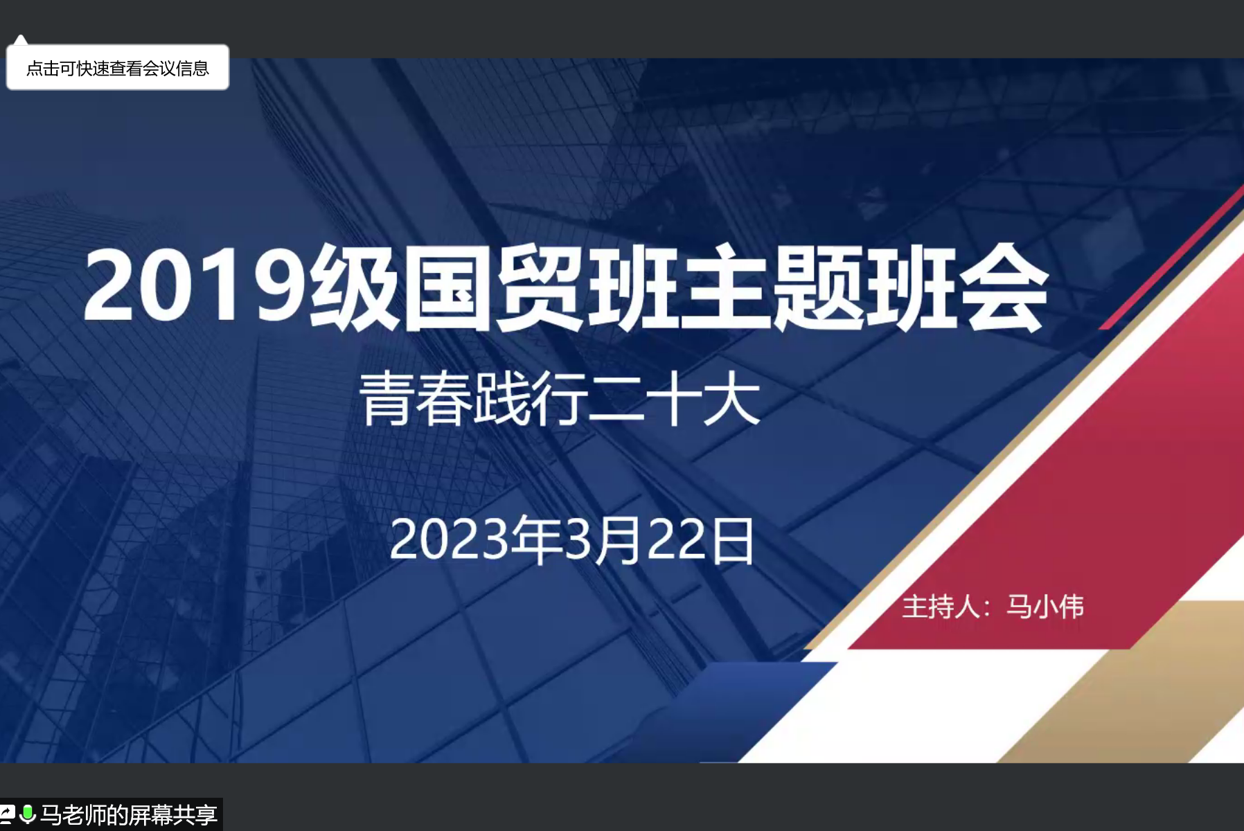 在19国贸主题班会上,辅导员马小伟老师结合时事热点,组织观看两会相关视频,引导同学们了解时政热点,关注老员工就业政策,树立正确就业观念,找准自身就业方向,积极主动适应劳动力市场的需求。