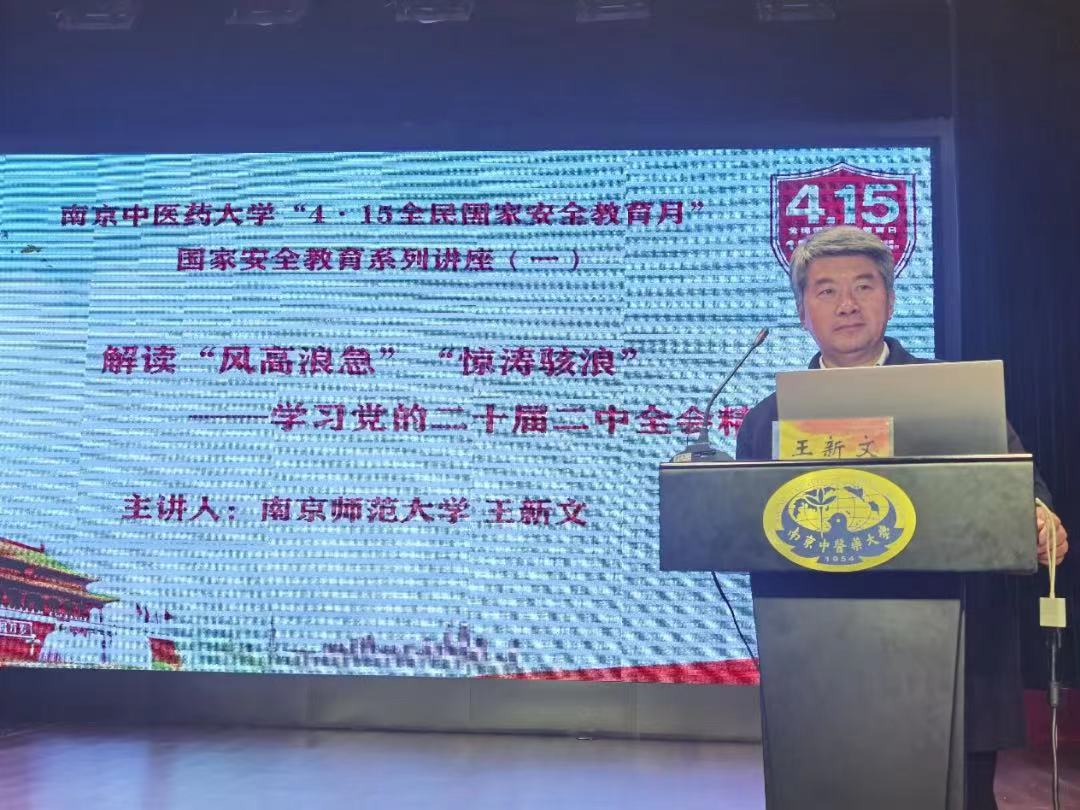 江苏省普通高校军事课教学委员会原秘书长、南京师范大学离退休党工委书记王新文老师以《解读“风高浪急”、“惊涛骇浪” ——学习党的二十届二中全会精神》为题,围绕全会公报指出的“风高浪急”、“惊涛骇浪”这两个关键词,分别从中国所面临的挑战、美国朝野“遏制中国”的政治共识、经济上贸易战、金融战、军事上围堵中国,以及中国外交、经济、军事等领域有理有力有节地斗争等方面,为在场的300余位师生送上了一场精彩生动、干货满满的国家安全教育课、形势与政策课、党二十届二中全会精神宣讲课。