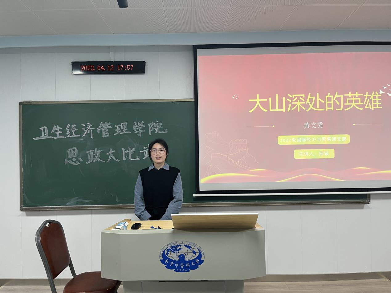 “大山深处的英雄” 来自国际经济与贸易专业2022级团支书邢颖同学,她声情并茂地将“第一书记”黄文秀扎根基层、为国家脱贫攻坚奉献出自己生命的故事娓娓道来。
