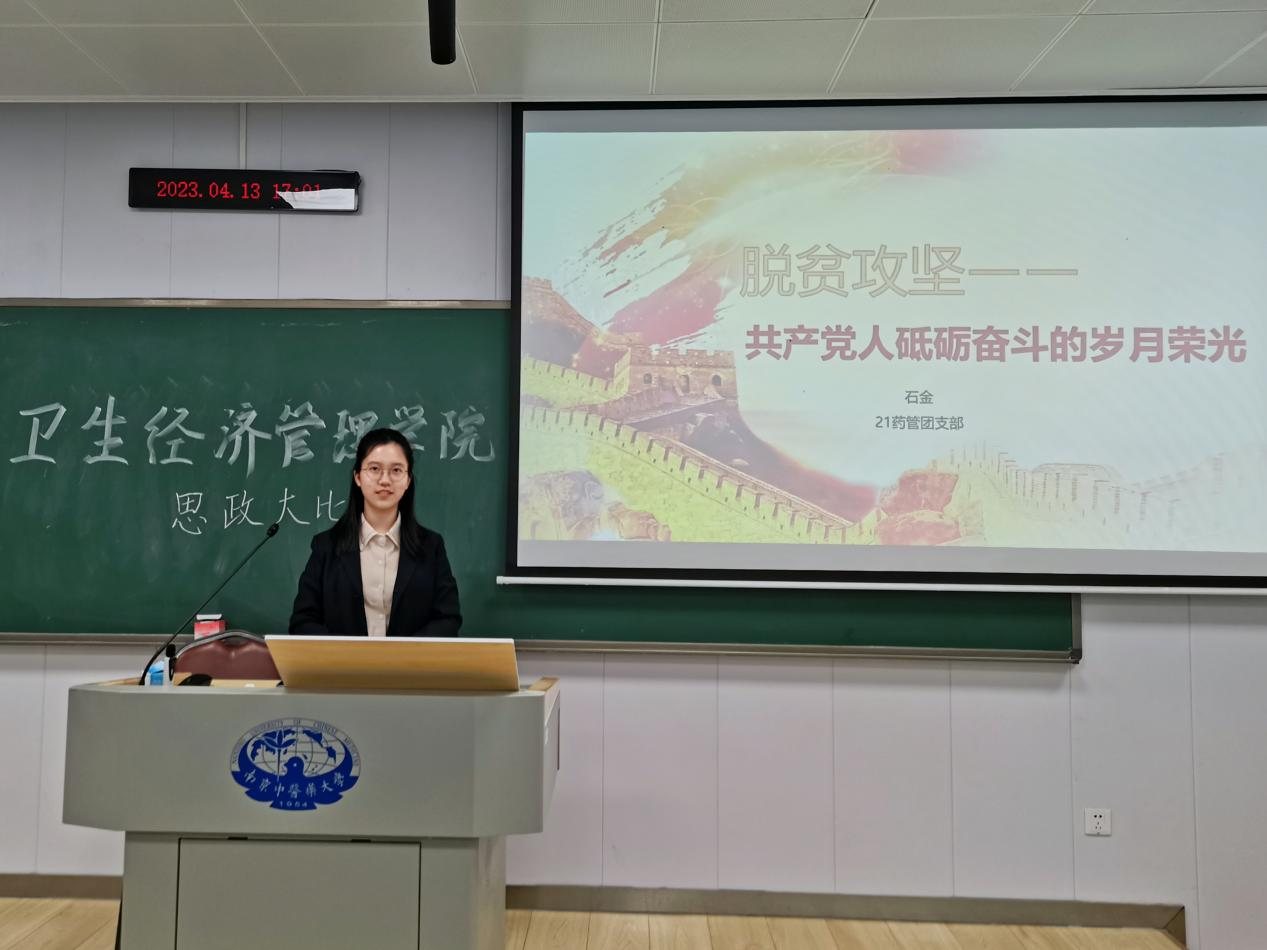 “脱贫攻坚——共产党人砥砺奋斗的岁月荣光”药事管理2021级专业团支部的石金同学,以“脱贫攻坚”为主题向同学们展示了中国共产党人在全面建成小康社会,实现党一百年奋斗目标路上砥砺奋斗的岁月荣光。