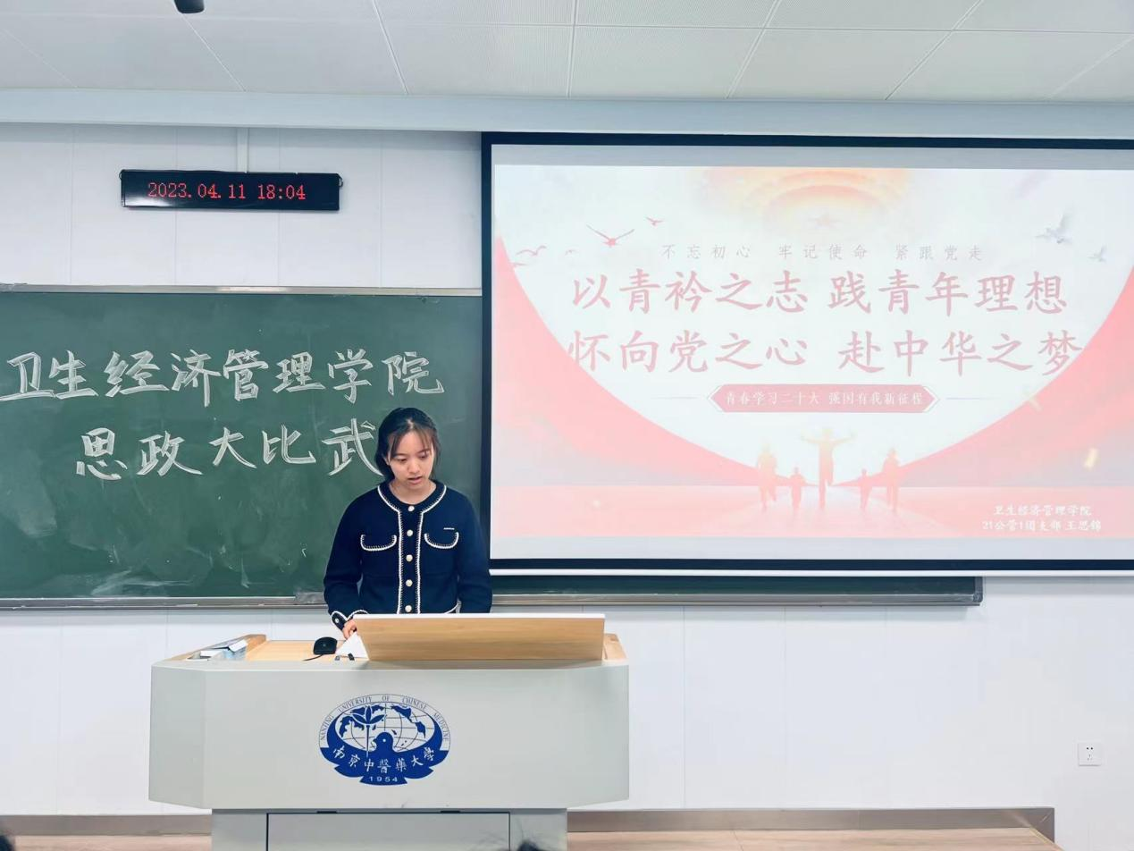 公共事业管理专业2021级1班团支书2王思锦同学,以“以青衿之志,践青年理想,怀向党之心,赴中华之梦”为主题,从小小红船开天辟地到如今泱泱大国迈进百年新征程,展现了中国共产党人矢志不渝、砥砺奋斗的伟大精神和崇高理想。她用生动鲜明的三个例子,向同学们讲述了当代青年将个人志与中国梦紧紧相连的故事,呼吁同学们践行青春誓言,谱写青春华章。