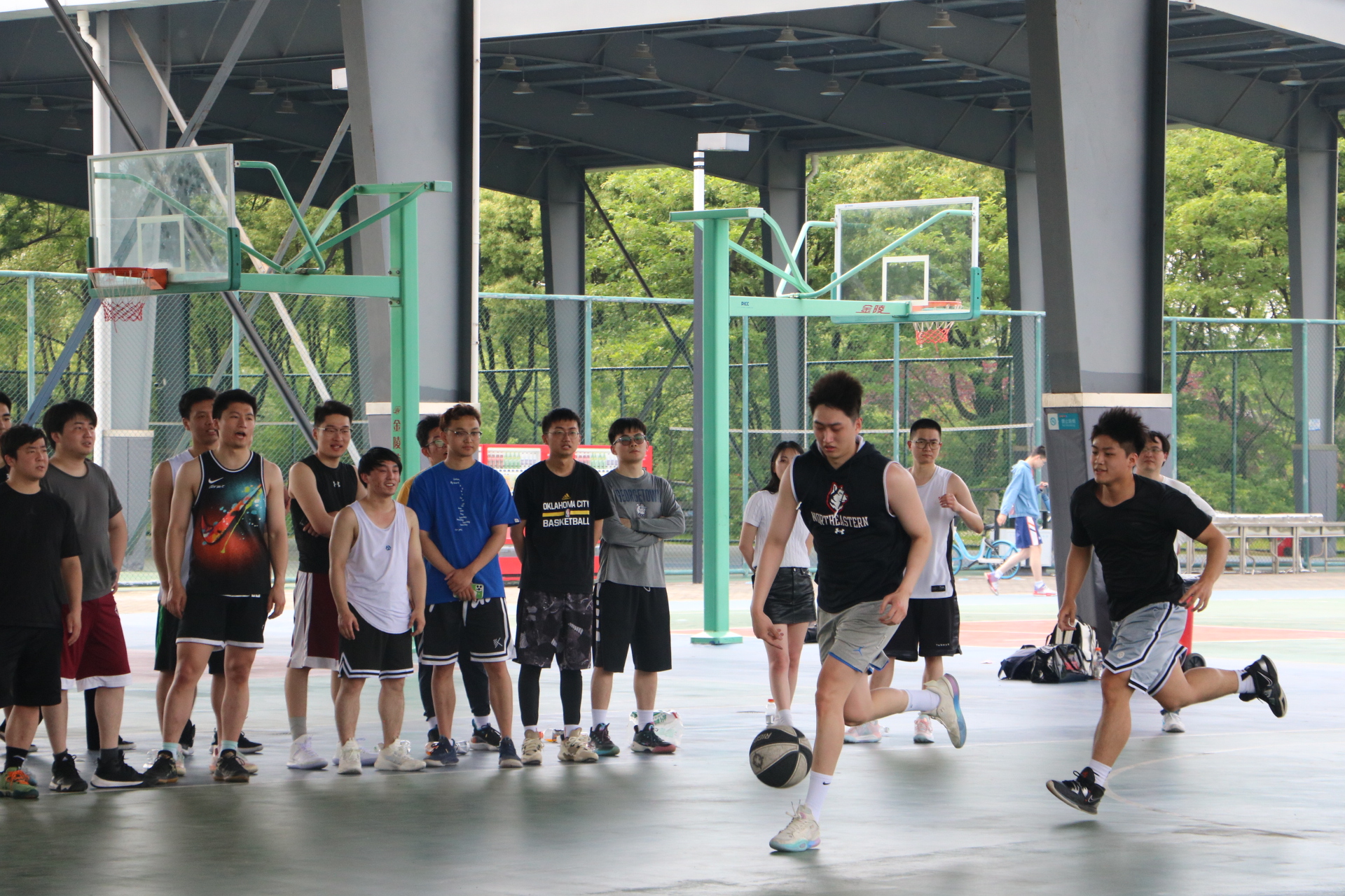 胜者组的决赛可谓是精彩倍加。只见一位占据身高优势的院友迅速接住传球,双手将球举过头顶,判断队友站位。接着一个高调传球,他的队友便默契地来了一个空接上篮,球中了!观众大声欢呼,精彩至极!