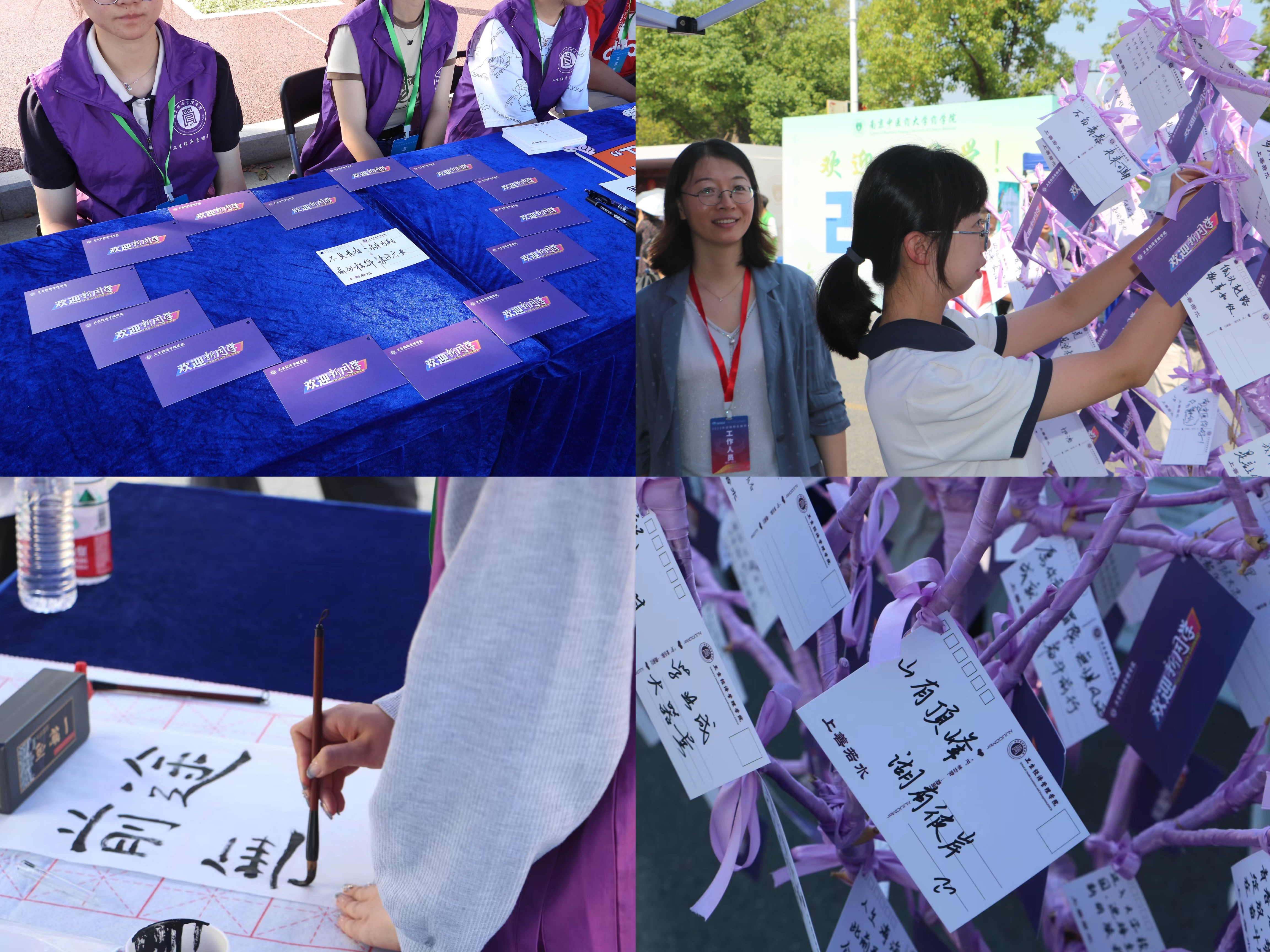 在特色展示区旁,一张张写满祝福的明信片汇聚成一颗紫色的“祝福树”,代表了williamhill对新生们最诚挚的祝福和最真诚的期望。萌新们一笔一划写下自己的梦想和目标,亲手将明信片系上“祝福树”。