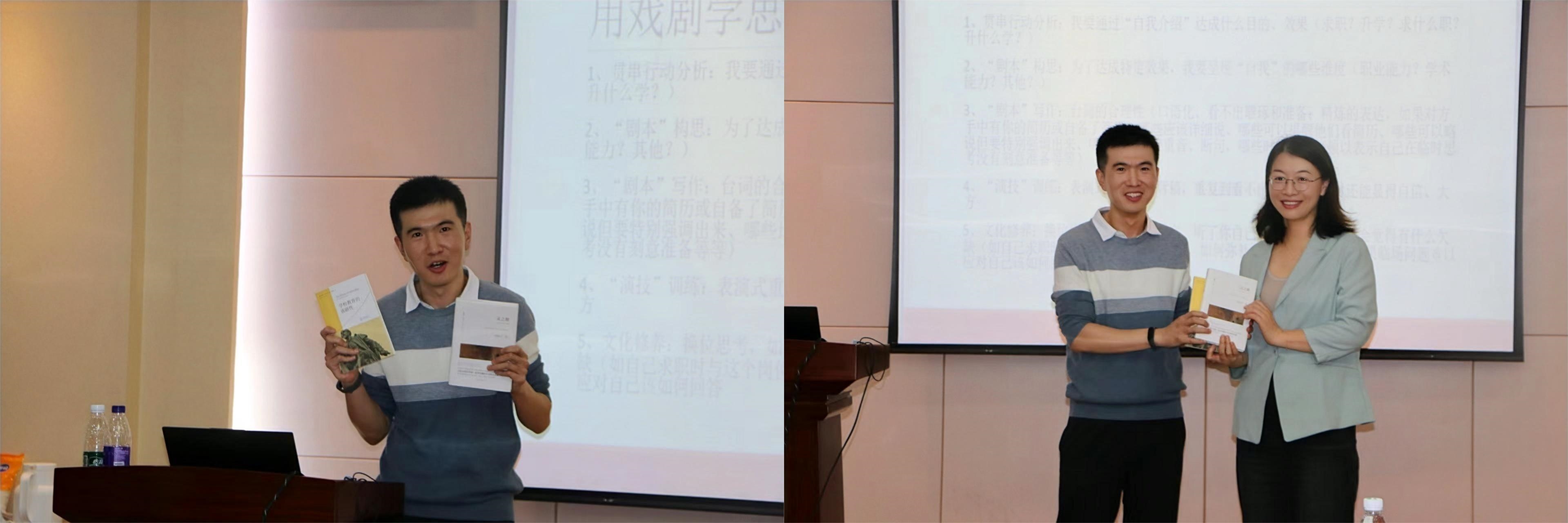 第三部分,杨光老师谈及了从艺术表演到社会表演的表演转向。杨老师先用几则热点示例说明了表演艺术的本质是由观众的“取景框”所决定的。在本次讲座的尾声,杨老师向同学们推荐《公司教育的戏剧性》和《灵之舞》这两本书,杨老师提到《公司教育的戏剧性》这本书以一种全新的眼光揭示了公司教育的内在本质,即人类戏剧,使同学们对戏剧思维有更进一步的了解,此外杨老师将这两本书赠予公司党委副书记、副经理蒋燕老师并合影留念。最后,杨光老师重点论述了表演的启示力、好的表演与精彩人生的关联性,并提议同学们可用戏剧学思维展开自我介绍,同学们纷纷表示收获满满。