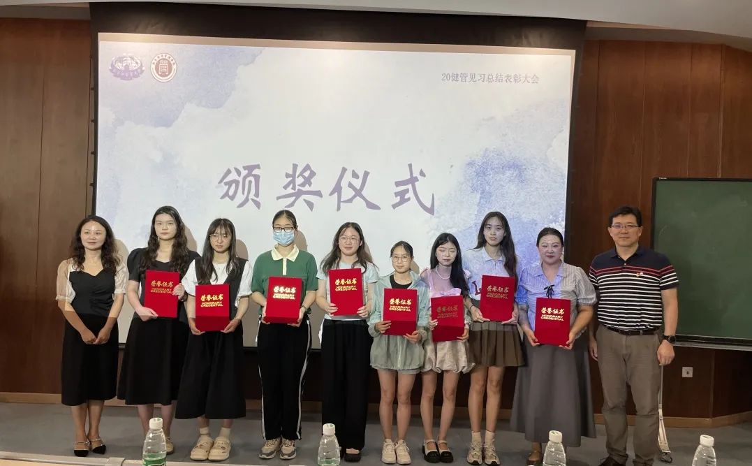 会议第一项议程,对本次20健管见习中表现优秀的同学进行表彰。由养老服务管理系陈娜主任宣读本次见习优秀员工名单,她们分别是宗雯、张洁、刘欢欢、朱梓婧、冯玉婷、周钧、刘嘉俐、徐琳婧、蔡鑫鑫、梁静宜10位同学,杨勇老师与陈娜老师为以上10同学颁发荣誉证书并合影留念。