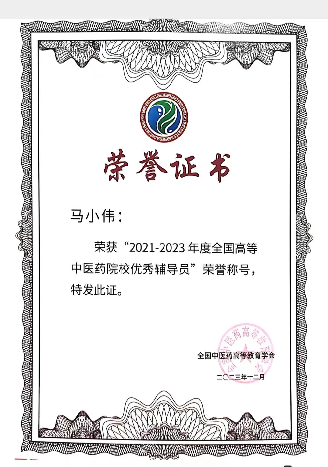 公司辅导员马小伟老师荣获“2021-2023年度全国高等中医药院校优秀员工工作者”称号。