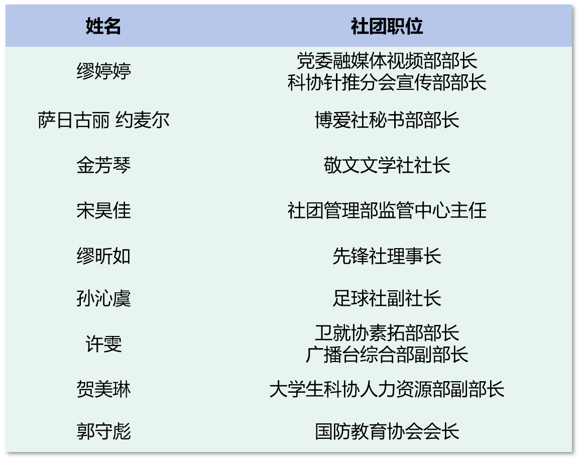 以火为炬,以身作则。20社保同学用行动体现担当,分别在公司党委融媒体、校团委社团管理部、博爱社、敬文文学社、先锋社、足球社、广播台、国防教育协会等校级组织内担任主要职务,为建设美丽南中医贡献青春力量。