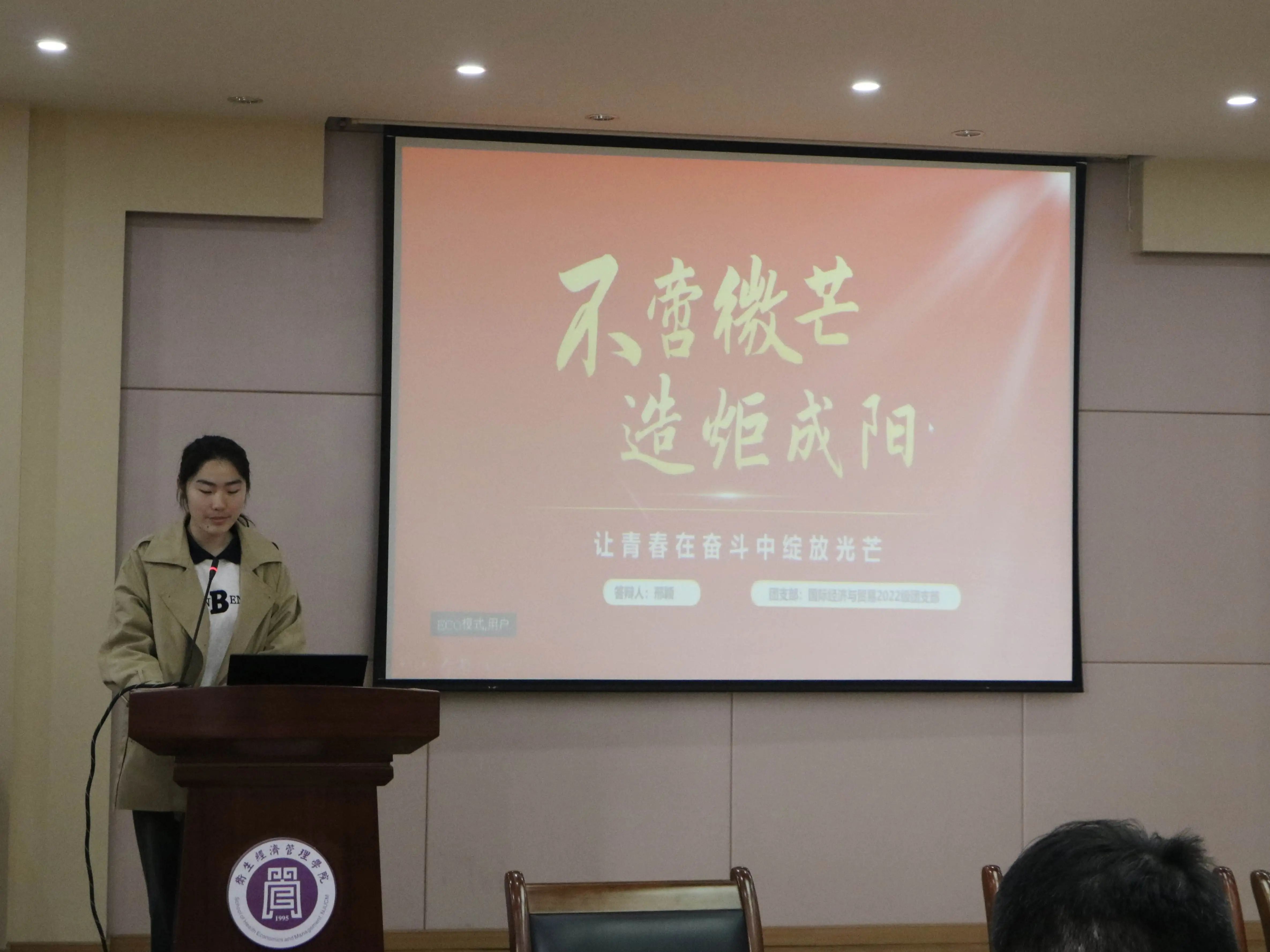 来自22国贸的邢颖代表公司参与”十佳团支书“的评选,作为团支书的她成绩优异,绩点排名连续两个学期为专业第一;积极参与思想学习、志愿服务和社会实践,志愿服务时长累计140小时。她思想信念坚定,积极向党组织靠拢,于2022年10月递交入党申请书,积极参加青马工程提升政治素养,并顺利通过考核,成为了入党积极分子。同时,她还积极倡导以多元的活动形式为载体,带领支部规范开展三会两制一课,创新提出“一支五组”的学习模式,让团员青年在参与中感悟、在体验中成长。她表示她将继续带领团支部深入学习习近平新时代中国特色社会主义思想,以社会主义核心价值观为行动指南,严格遵守章程,带动团员青年加强思想学习。