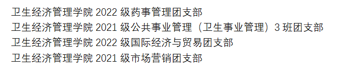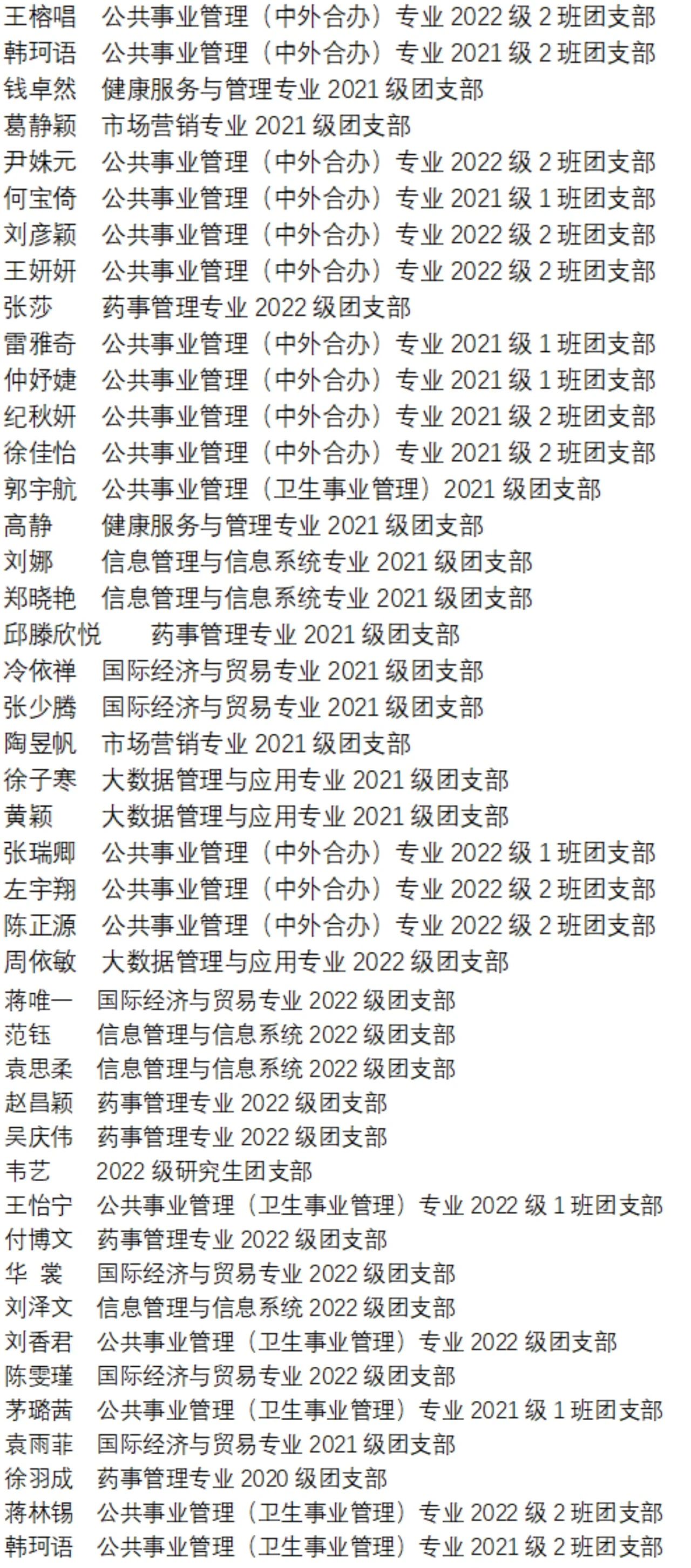 在过去一年中,公司各团支部及广大团员青年在思想引领、组织建设、社会实践、志愿服务等方面做出了突出贡献并取得了优异成绩。在校团委和公司党委的领导下,williamhill团委坚持弘扬先进、树立典型,院系多个团支部及多名青年团员在共青团williamhill威廉希尔委员会五四表彰中斩获荣誉。杜启霞老师获“青年五四奖章(老师)”,闫思盟老师获“校级优秀共青团干部”,2021级公共事业管理(卫生事业管理)专业谢中骏获“青年五四奖章(员工)”,2022级国际经济与贸易专业邢颖获“十佳团支部书记”,44名员工获“校级优秀共青团员”,16名员工获“校级优秀共青团干部”。