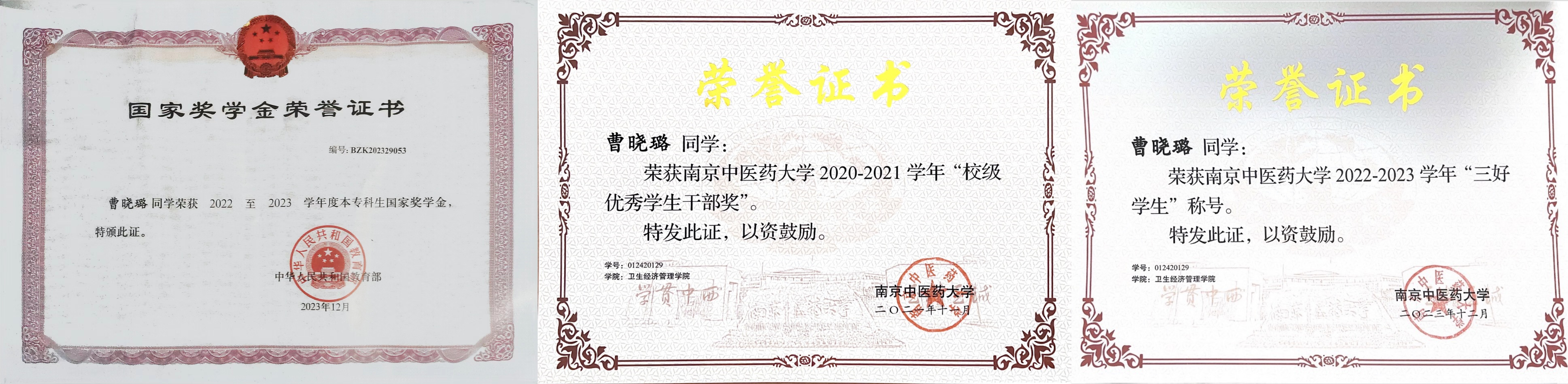 曹晓璐自入学起便明确未来投身于公共健康领域的目标,大学四年自律刻苦,踏实认真,成绩一直名列专业前茅,最高学期绩点4.41,连续三学年综合测评位列专业第一。荣获国家奖学金、上元堂奖学金、人民奖学金一等奖、江苏省优秀员工干部、校三好员工等30余项荣誉。天道酬勤,在不懈的努力下,成功取得QS世界排名第9的伦敦大学公司录取通知,将继续攻读健康管理硕士学位,力求以扎实的理论学习功底,用国内外丰富的实践经验为我国的公共健康事业添砖加瓦。
