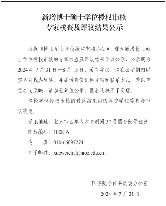 7月31日,国务院学位办发布《新增博士硕士学位授权审核专家核查及评议结果公示》。本次学位授权审核结果公示包括新增博士学位授权点审核结果、新增硕士学位授权点审核结果、新增博士硕士学位授予单位、新增学位授权自主审核单位。