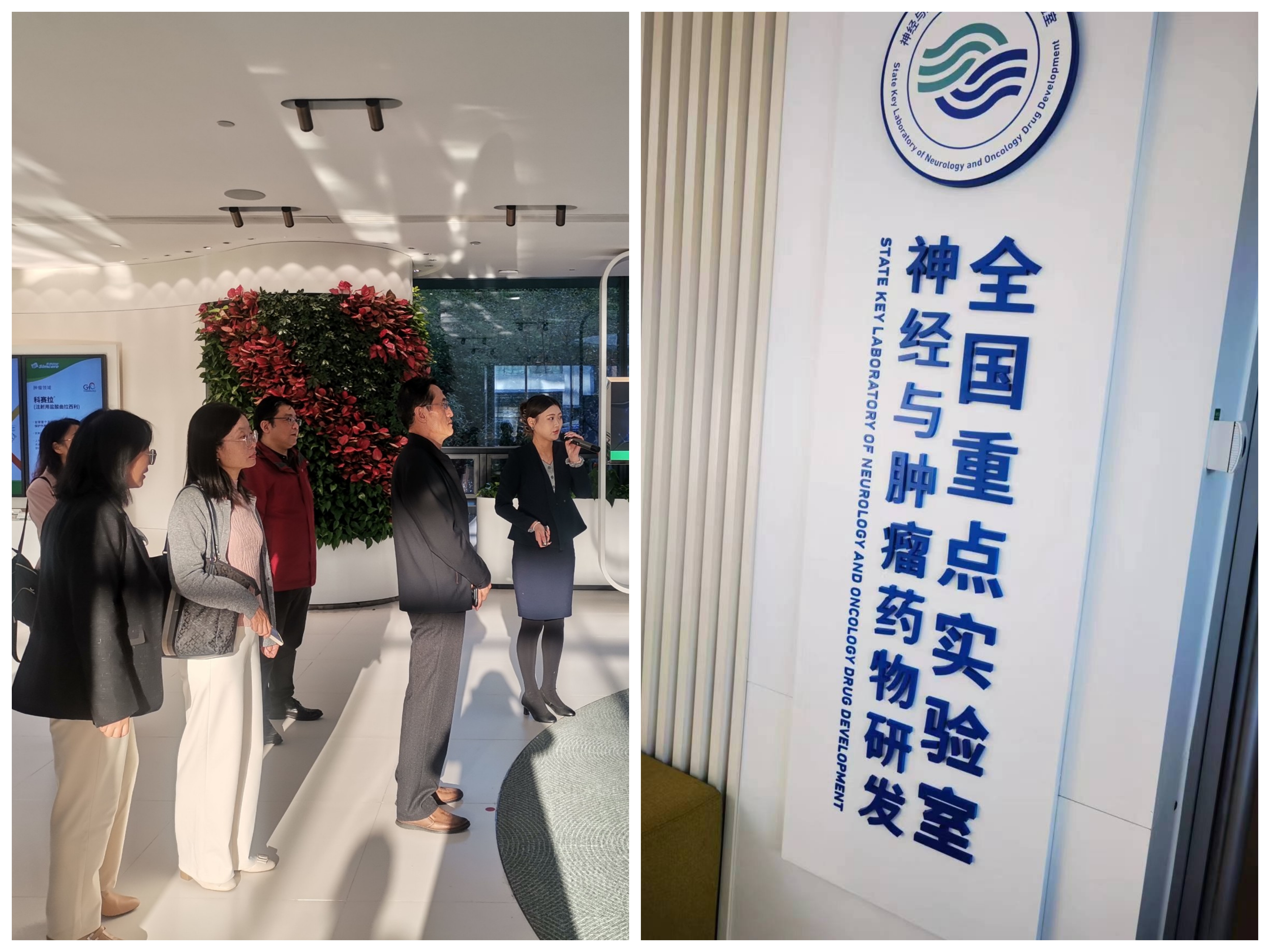 专职讲解员结合一楼展厅内容为大家介绍企业的核心业务和最新研发成果,引领师生参观了神经与肿瘤药物研发全国重点实验室。