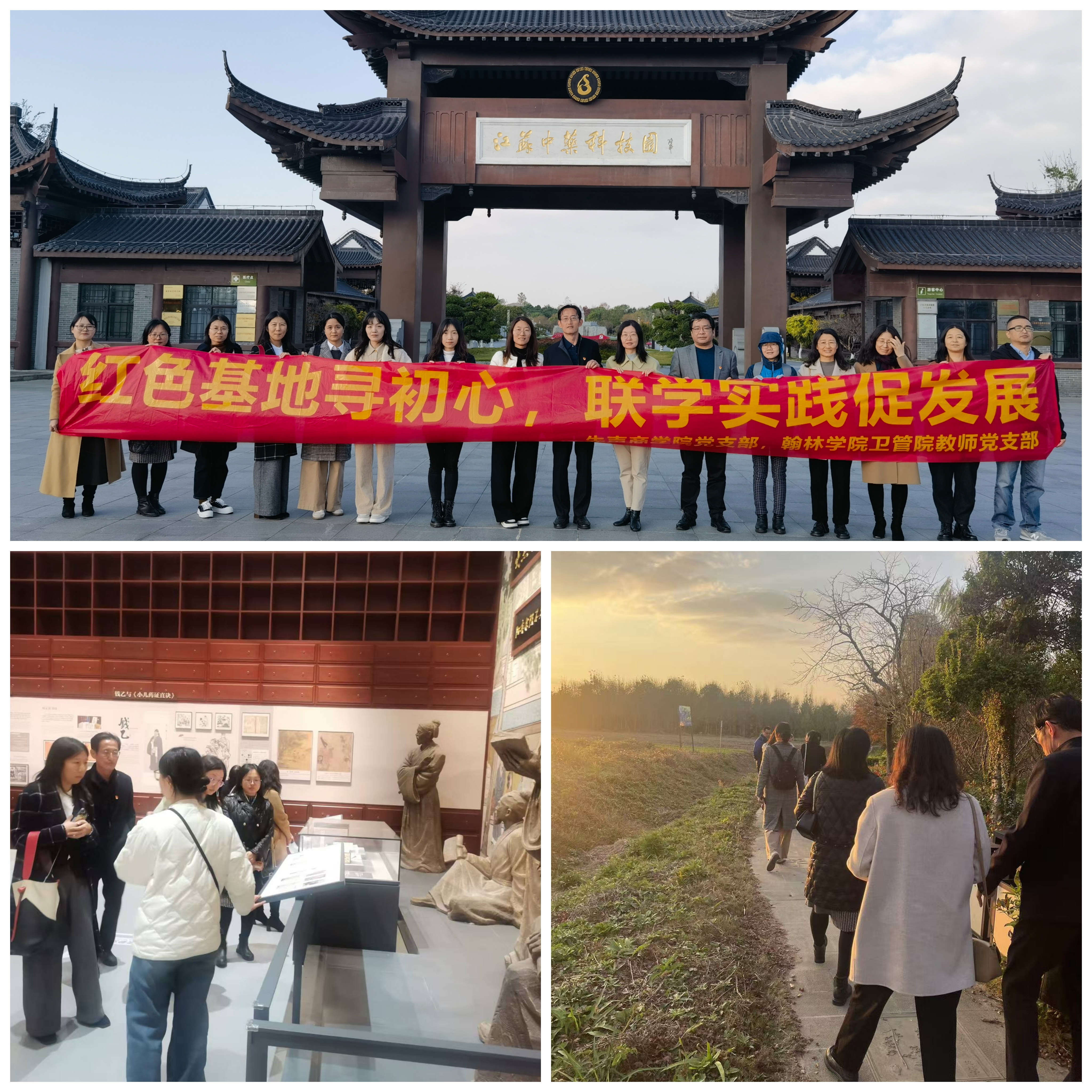 支部在江苏神奇中药科技有限公司下辖的江苏中医药科技园展开调研。科技园设计精妙,处处体现中国文化艺术,园内遍植药材,是一座美学与药学的宝库。中药文化馆内汇集展出了大量珍贵历史资料和实物,并利用现代化手段多维科普中医药知识。教师们在此感受到中医药的博大精深和中华文化的深厚底蕴。恰是“中药园内百草香,文化馆中古籍藏”。