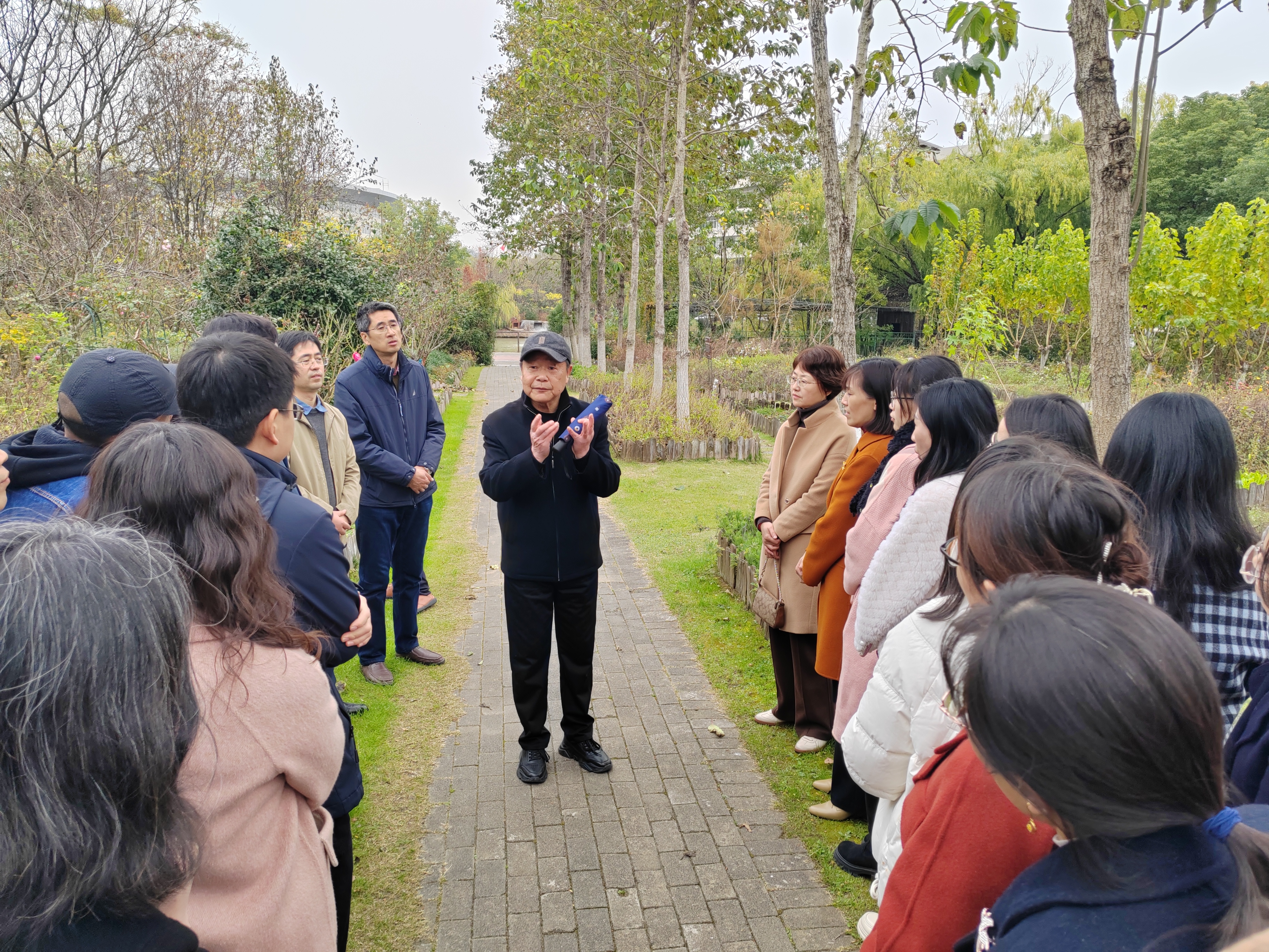 随后,谈献和教授带领老师们在江苏地道地产药材区、中药功效区、观赏中药区、景观长廊等诸多功能区作专业而生动的讲解。园内一草一木看似只是普通的植物,但在谈老师如数家珍般的讲述下,老师们便很快了解其种类、形态结构、地理分布、生长习性、药用价值、加工方式及类别区分等信息。