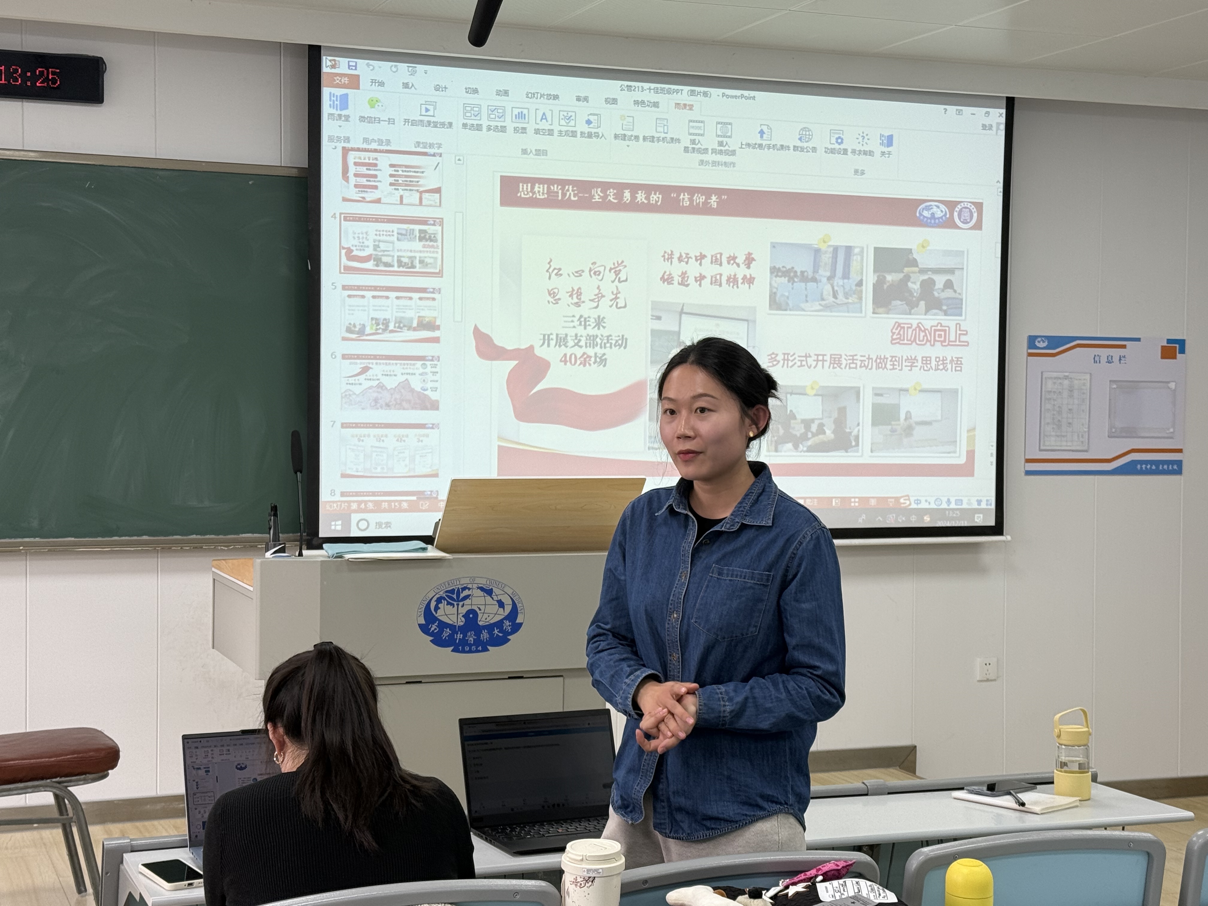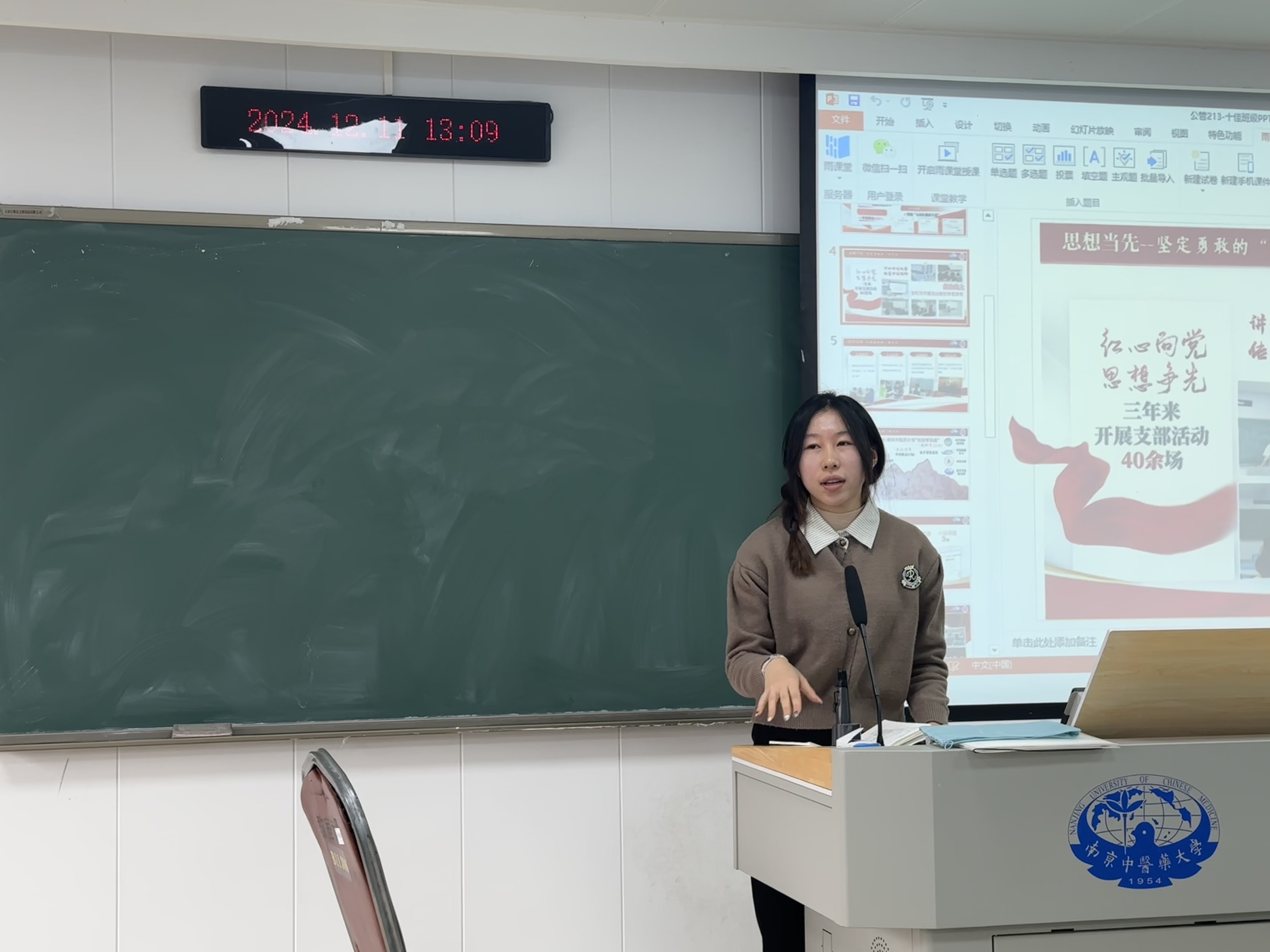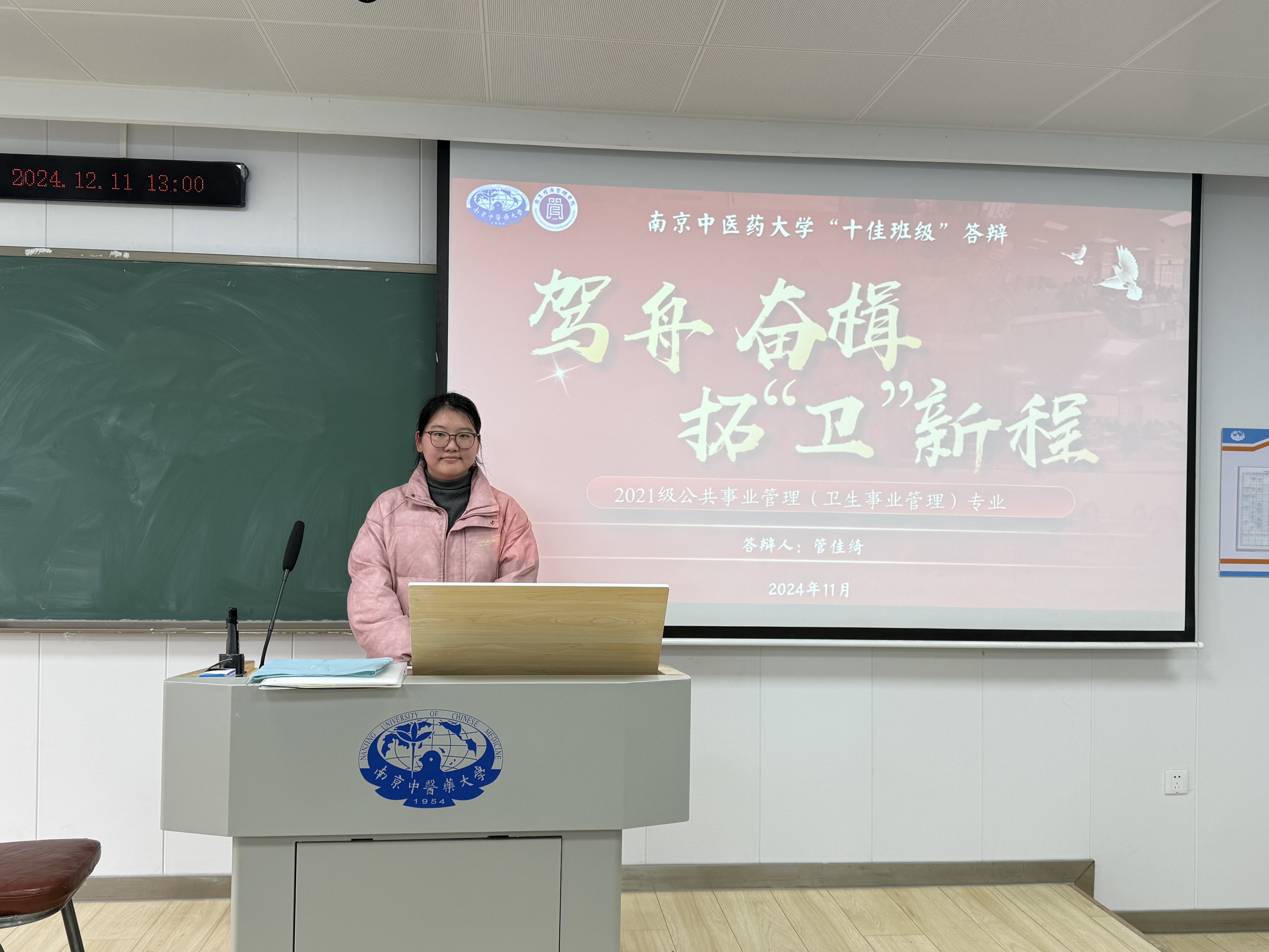 会议中,公管213班委代表管佳绮同学结合“十佳班级”材料分享了他们在党团建设、学风营造、志愿服务、班级管理等方面的经验。作为班级学习委员,她也分享了自己的管理秘籍。其一,推行班委带头坐前排,发挥榜样力量,引领全班形成前排就座风尚,提升课堂专注度。其二,善用小程序收集数据,高效便捷掌握同学信息填写进度。其三,期末精心梳理重难点助力同学复习,组织互助学习群,成员打卡汇报,营造浓厚学习氛围。此系列举措成效斐然,班级学习热情高涨、成绩稳步提升。