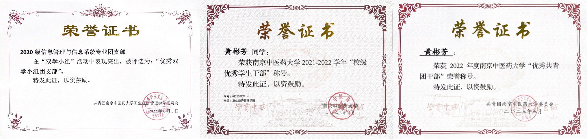 忙碌的底色之下,先后担任班级班长、团支书的经历,促使她全面提升执行力。她始终将集体荣誉置于首位,在形式多样的主题活动举办中,支部工作见成效,班集体先后获得校“五四红旗团支部”、院“优秀双学小组团支部”等多项荣誉称号。她于员工工作中收获弥足珍贵的经验,并获得校“优秀共青团干部”、校“优秀员工干部”等荣誉称号7次。