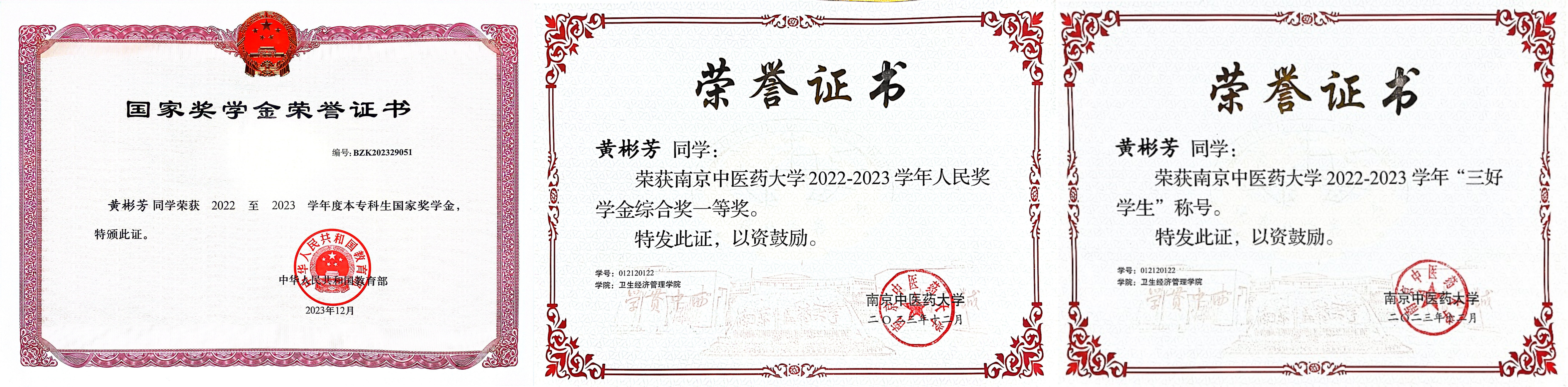 以学为基,赋能升级。黄彬芳数门主修课程高分通过,以总平均学分绩点4.32的成绩位列专业第一,各学年综合素质分稳步提高,获得国家奖学金、校人民奖学金一等奖等多项荣誉,被评为江苏省“三好员工”。