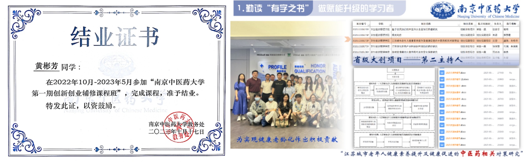 作为公司第一期创新创业辅修课程班学员,她紧密结合中医药发展需求,主持一项省级大创项目“江苏城市老年人健康素养提升及健康促进的中医药相关对策研究”。科研道路面临各种考验,但磨砺并未使她退却。在此期间,她反复梳理研究思路,多次修改问卷访谈,进行实地资料收集,注重发挥团队力量。那颗护佑人民健康的种子早已深埋心底。她深知通过参与科研项目来培养学术素养的重要性,因此抓住机会参与了“一带一路背景下基于中医药的慢性病防控合作路径研究”市级重点课题项目,进一步学习论文思路框架和写作脉络,体会学术研究独有的温度。她以第一作者身份撰写的论文已成功发表于SCI收录期刊Cancer Epidemiology。