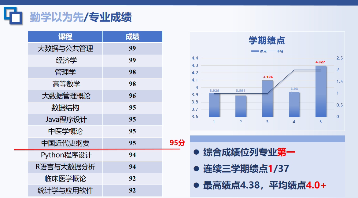 通过对中医药事业的了解和大数据专业技能的学习,姚星深切明晰自己需要突破的专业方向,树立了通过大数据以及统计学相关知识为流行病学研究贡献一生的理想。他勤奋刻苦,大学三年自律自强,成绩始终名列前茅,综合成绩位列专业第一,最高学期绩点4.38。30余门专业课成绩高于90分,获人民奖学金等多项荣誉。