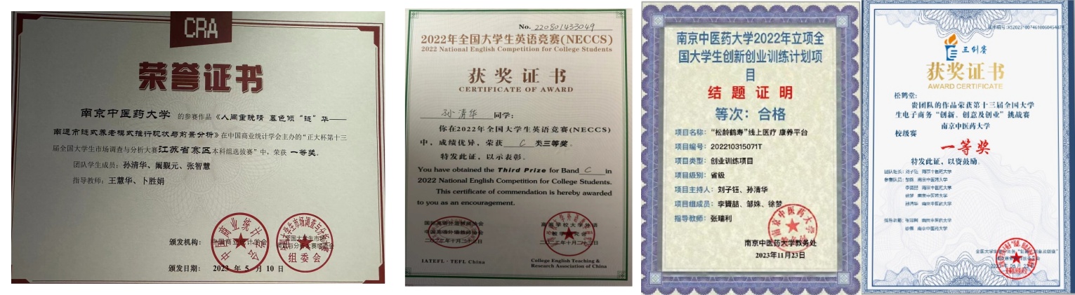 在创新中求索,博采以躬行,大学三年她的科研活动都与公共事业管理紧紧挂钩。她以主创身份主持省级大创项目《“松龄鹤寿”线上医疗 康养平台》,于今年11月份结题,项目从公共卫生角度出发,旨在结合中医知识预防中老年人失能。该项目获得校电子商务三创赛一等奖等多项校级奖项。此外,她以第一主创身份主持正大杯全国老员工市场调查与分析大赛,并获省级一等奖以及多项校级奖项。现有一篇有关老年人社区居家养老的五万余字的调研报告,她认为公共卫生服务社会也应走进社区,融入社区对老年人的各项服务中。