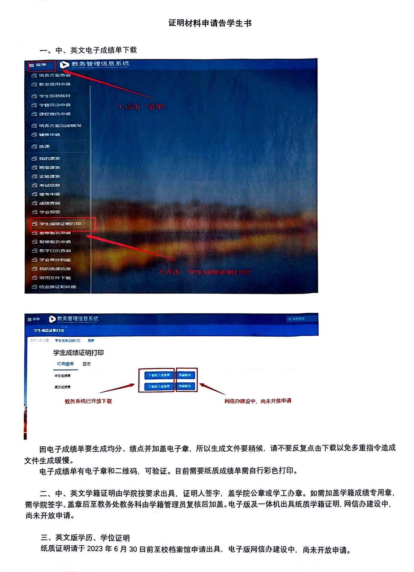以下图片是关于在校生在籍证明、中英文成绩单证明、成绩绩点说明下载指南,有需要的同学们可自行登录系统或者网站下载打印即可。