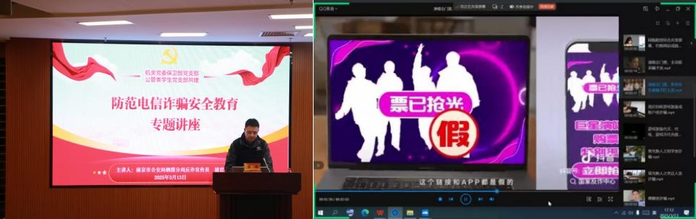 春风拂面,安全护航。3月14日下午,机关党委保卫部党支部与公司公管类员工党支部以支部共建为契机,共同开展防范电信诈骗专题讲座。本场讲座特别邀请了南京市公安局栖霞分局反诈宣传员褚君老师担任主讲嘉宾,为公司师生讲解防诈案例、传授防诈技巧。